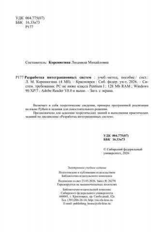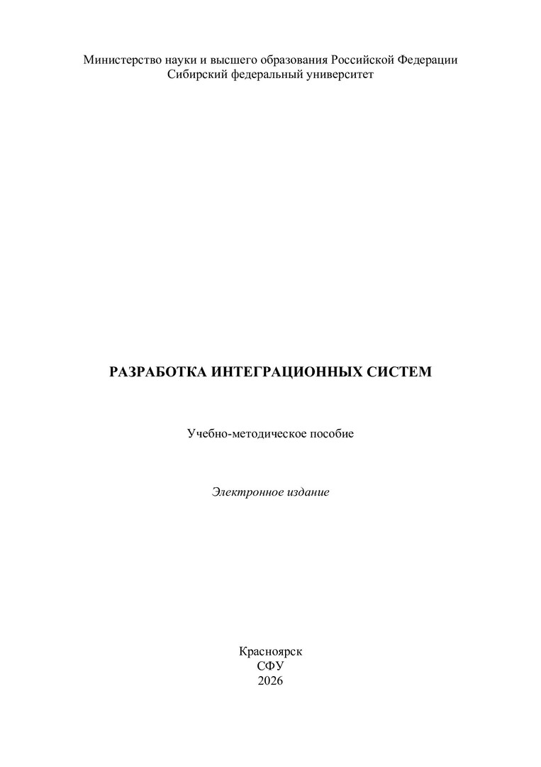 Библиографическое описание:Разработка интеграционных систем : учебно-методическое пособие / Сибирский федеральный университет, Институт космических и информационных технологий ; сост. Л. М. Коренюгина. - Электрон. текстовые дан. (pdf, 2.9 Мб). - Красноярск : СФУ, 2026 (2026-03-23). - 84 с. : схемы, табл. - Загл. с титул. экрана. - Библиогр.: с. 82-84. - Изд. № 2026-26270 : Б. ц. - Текст : электронный.