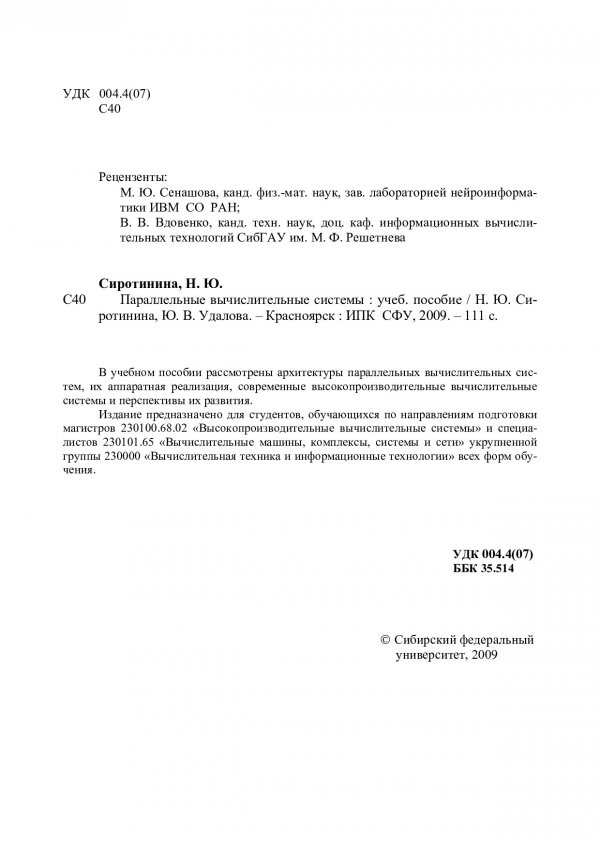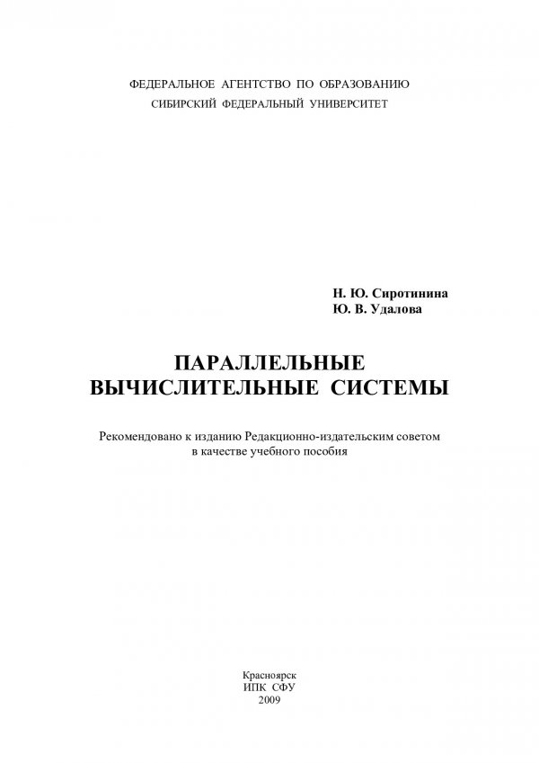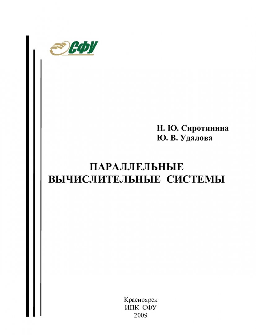 Библиографическое описание: Сиротинина, Наталья Юрьевна. Параллельные вычислительные системы : учебное пособие / Н. Ю. Сиротинина, Ю. В. Удалова ; Сиб. федер. ун-т, Ин-т космич. и информ. технологий. - Красноярск : ИПК СФУ, 2009. - 111 с. : ил. - Библиогр.: с. 108-109. - 100 экз. - Текст : непосредственный + Текст : электронный.