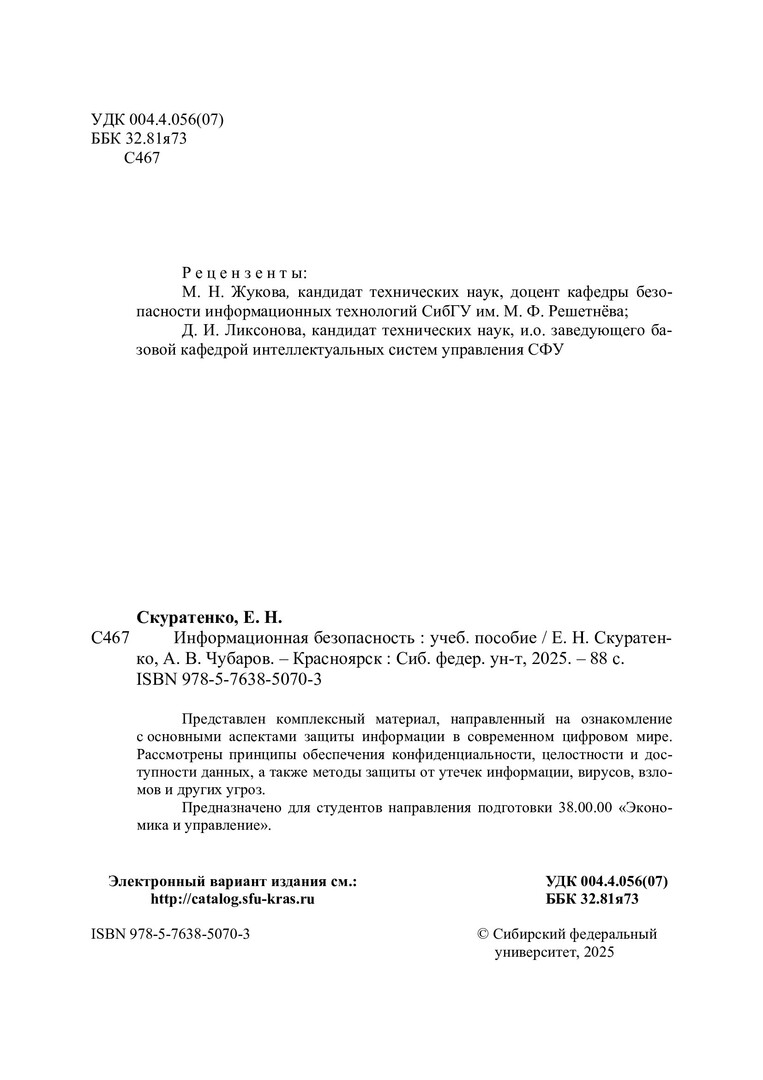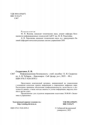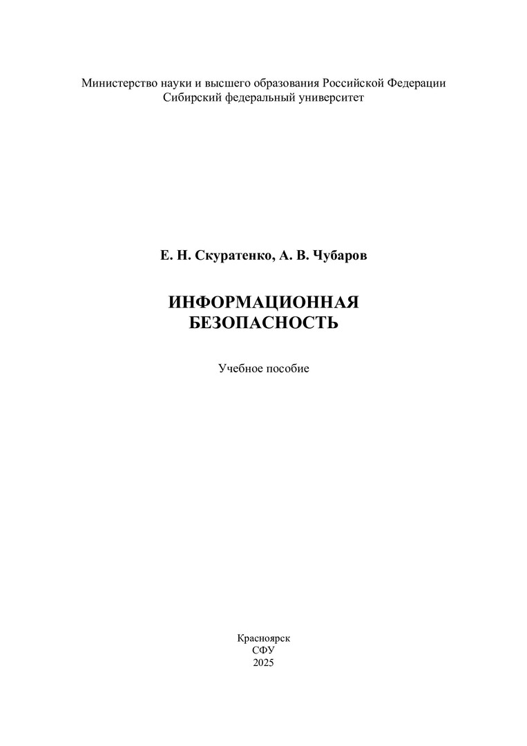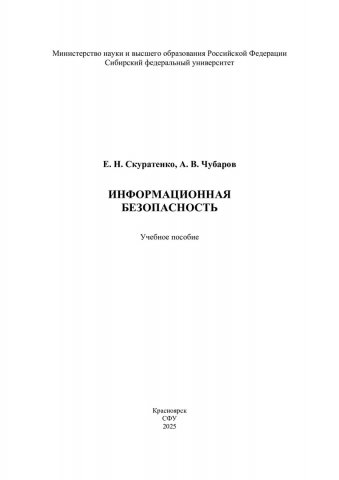 Библиографическое описание: Скуратенко, Елена Николаевна. Информационная безопасность : учебное пособие / Е. Н. Скуратенко, А. В. Чубаров ; рец.: М. Н. Жукова, Д. И. Ликсонова ; Сибирский федеральный университет, Институт управления бизнес-процессами. - Электрон. текстовые дан. (pdf, 2.1 Мб). - Красноярск : СФУ, 2025 (2025-08-15). - 88 с., 5.5 усл. печ. л. : табл., цв. ил., схемы. - Загл. с титул. экрана. - Электрон. версия печ. публикации . - Библиогр.: с. 74-76. - 100 экз. - ISBN 978-5-7638-5070-3 : Б. ц. - Изд. № 2024-23095. - Текст : электронный.