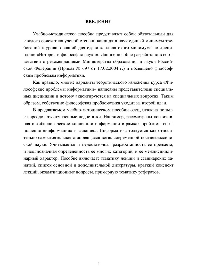 Аннотация: Составлено в соответствии с программой кандидатского экзамена «История и философия науки» («Современные философские проблемы областей научного знания»), утвержденной Приказом Министерства образования РФ № 697 от 17.02.2004. Посвящено философским проблемам информатики. Представлены вопросы философского понимания понятий: «информация», «информационная реальность», «информационное пространство», «виртуальная реальность», «киберпространство», «знание» и т. п. Рассмотрены общие закономерности исторического развития информатики как науки об информации. Предназначено для аспирантов и соискателей, готовящихся к экзаменам кандидатского минимума по «Истории и философии науки».