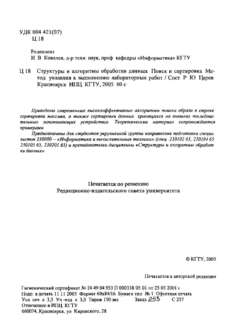 Библиографическое описание:Царев, Роман Юрьевич. Структуры и алгоритмы обработки данных. Поиск и сортировка : метод. указ. к выполнению лаб. работ / Р. Ю. Царев ; Краснояр. гос. техн. ун-т. - Красноярск : ИПЦ КГТУ, 2005. - 60 с. - (Учебно-методическая литература). - 150 экз. - Текст : непосредственный + Текст : электронный.