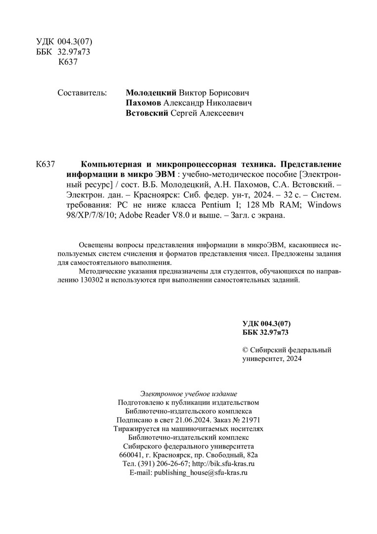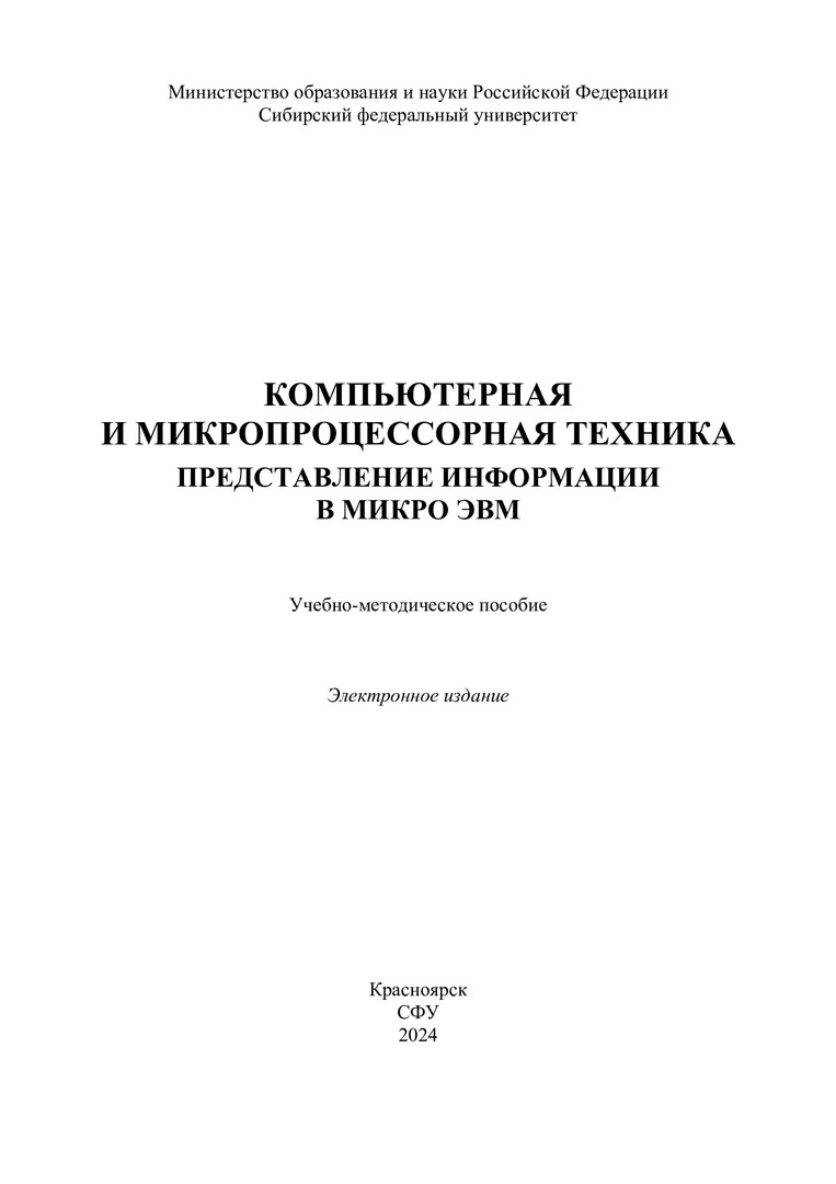 Библиографическое описание: Компьютерная и микропроцессорная техника. Представление информации в микро ЭВМ : учебно-методическое пособие / Сиб. федер. ун-т, Политехн. ин-т ; сост.: В. Б. Молодецкий, А. Н. Пахомов, С. А. Встовский. - Электрон. текстовые дан. (pdf, 0,5 Мб). - Красноярск : СФУ, 2024. - 32 с. - Загл. с титул. экрана. - Изд. № 2024-21971 : Б. ц. - Текст : электронный.