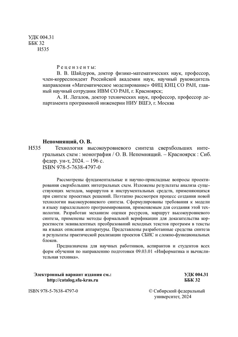 Библиографическое описание: Непомнящий, Олег Владимирович. Технология высокоуровневого синтеза сверхбольших интегральных схем : монография / О. В. Непомнящий ; рец.: В. В. Шайдуров, А. И. Легалов ; Сибирский федеральный университет, Институт космических и информационных технологий. - Электрон. текстовые дан. (3,4 Мб). - Красноярск : СФУ, 2024 (2024-07-03). - 196 с., 12.3 усл. печ. л. - Загл. с титул. экрана. - Электрон. версия печ. публикации . - Библиогр.: с. 174-183. - 500 экз. - ISBN 978-5-7638-4797-0 : Б. ц. - Изд. № 2023-18175. - Текст : электронный.
