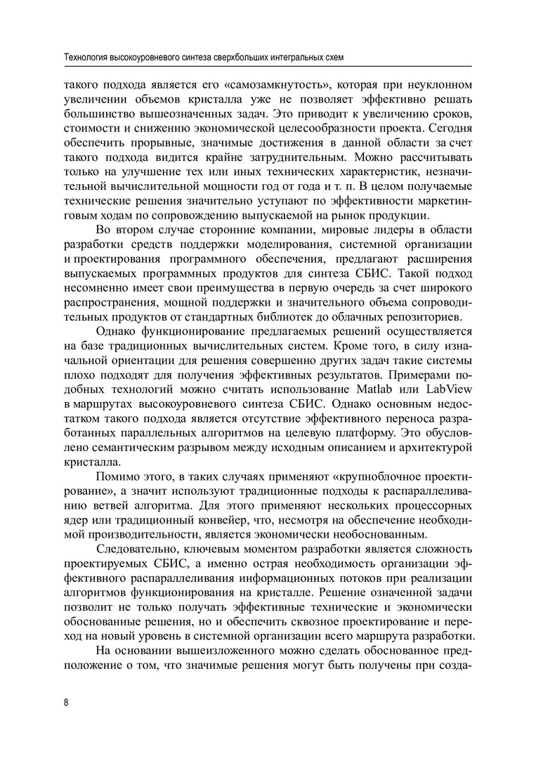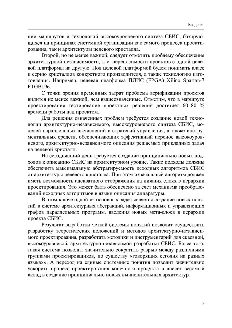 Аннотация: Рассмотрены фундаментальные и научно-прикладные вопросы проектирования сверхбольших интегральных схем. Изложены результаты анализа существующих методов, маршрутов и инструментальных средств, применяющихся при синтезе проектных решений. Поэтапно рассмотрен процесс создания новой технологии высокоуровневого синтеза. Сформулированы требования к модели и языку параллельного программирования, применяемым для создания этой технологии. Разработан механизм оценки ресурсов, маршрут высокоуровневого синтеза, применены методы формальной верификации для доказательства корректности эквивалентных преобразований исходных текстов программ в тексты на языках описания аппаратуры. Представлены разработанные средства синтеза и результаты практической реализации проектов СБИС и сложно-функциональных блоков. Предназначена для научных работников, аспирантов и студентов всех форм обучения по направлению подготовки 09.03.01 «Информатика и вычислительная техника».