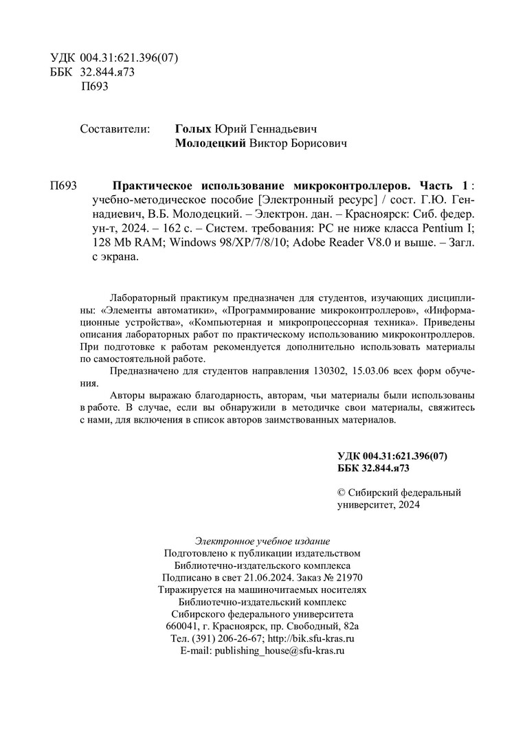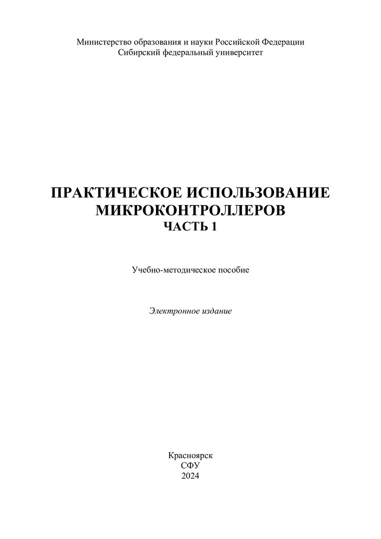 Библиографическое описание: Практическое использование микроконтроллеров. Часть 1 : учебно-методическое пособие / Сиб. федер. ун-т, Политехн. ин-т ; сост.: Ю. Г. Голых, В. Б. Молодецкий. - Электрон. текстовые дан. (pdf, 8 Мб). - Красноярск : СФУ, 2024. - 162 с. - Загл. с титул. экрана. - Изд. № 2024-21970 : Б. ц. - Текст : электронный.