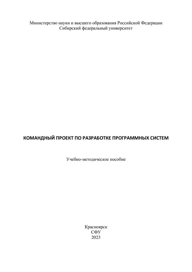 Библиографическое описание:Командный проект по разработке программных систем : учебно-методическое пособие / Сибирский федеральный университет, Институт космических и информационных технологий ; сост. А. В. Хныкин. - Электрон. текстовые дан. (1,2 Мб). - Красноярск : СФУ, 2023 (2023-10-27). - 16 с. - Загл. с титул. экрана. - Электрон. версия печ. публикации . - Библиогр.: с. 11. - 100 экз. - Изд. № 2023-20140 : Б. ц. - Текст : электронный.