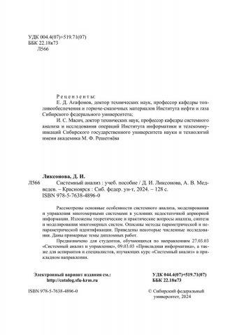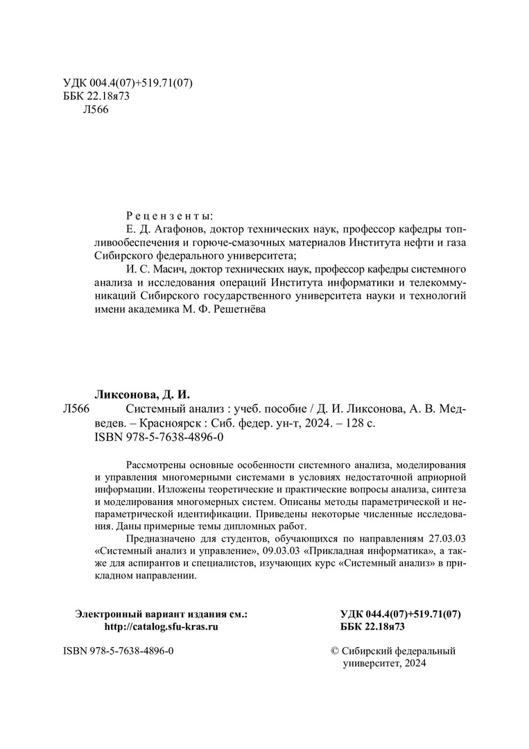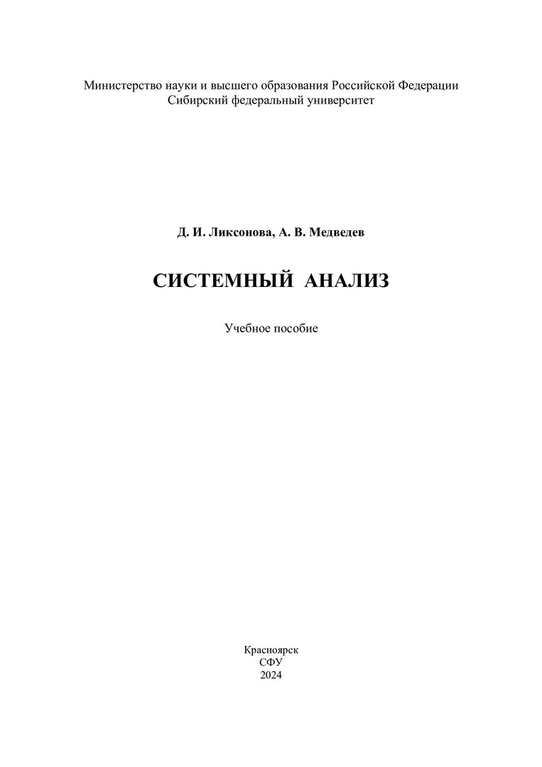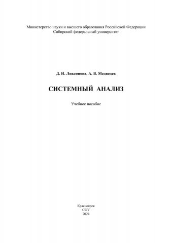 Библиографическое описание: Ликсонова, Дарья Игоревна. Системный анализ : учебное пособие / Д. И. Ликсонова, А. В. Медведев ; Сибирский федеральный университет, Институт космических и информационных технологий. - Электрон. текстовые дан. (2,5 Мб). - Красноярск : СФУ, 2024 (2024-10-03). - 128 с., 8.0 усл. печ. л. : рис. - Загл. с титул. экрана. - Электрон. версия печ. публикации . - Библиогр.: с. 116-118. - 100 экз. - ISBN 978-5-7638-4896-0 : Б. ц. - Изд. № 2023-20273. - Текст : электронный.