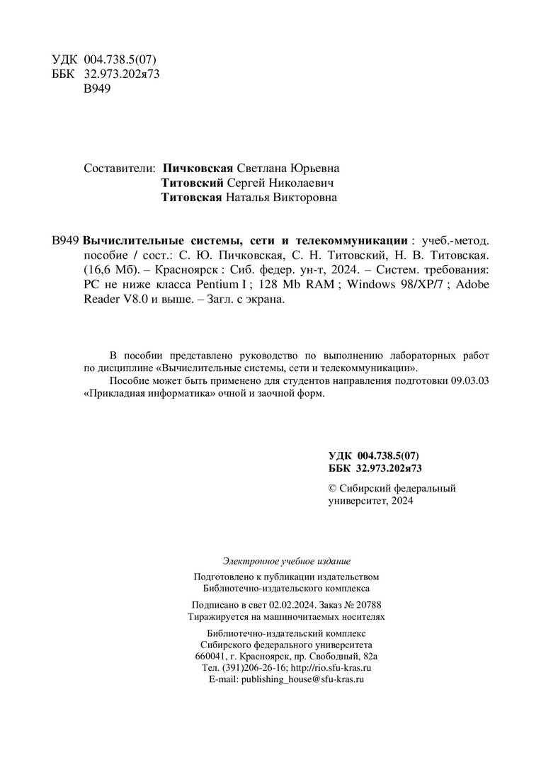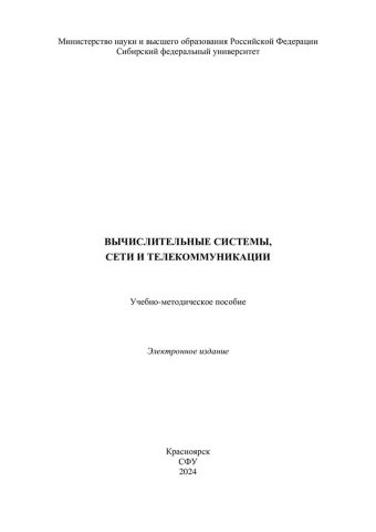 Библиографическое описание: Вычислительные системы, сети и телекоммуникации : учебно-методическое пособие / Сиб. федер. ун-т, Ин-т космич. и информ. технологий ; сост.: С. Ю. Пичковская, С. Н. Титовский, Н. В. Титовская. - Электрон. текстовые дан. (pdf, 16,3 Мб). - Красноярск : СФУ, 2024 (2024-02-02). - 201 с. - Загл. с титул. экрана. - Изд. № 2023-20788 : Б. ц. - Текст : электронный.