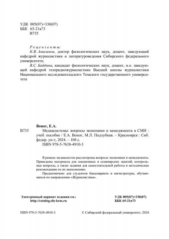 Библиографическое описание: Воног, Евгений Анатольевич. Медиасистемы: вопросы экономики и менеджмента в СМИ : учебное пособие / Е. А. Воног, М. Л. Подлубная ; рец.: К. В. Анисимов, В. С. Байдина ; Сибирский федеральный университет, Институт филологии и языковой коммуникации. - Электрон. текстовые дан. (2,1 Мб). - Красноярск : СФУ, 2024 (2024-03-13). - 108 с., 6.8 усл. печ. л. : граф., табл. - Загл. с титул. экрана. - Электрон. версия печ. публикации . - Библиогр.: с. 99-101. - 100 экз. - ISBN 978-5-7638-4910-3 : Б. ц. - Изд. № 2023-20481. - Текст : электронный.