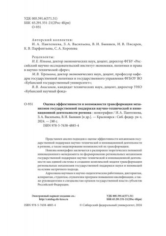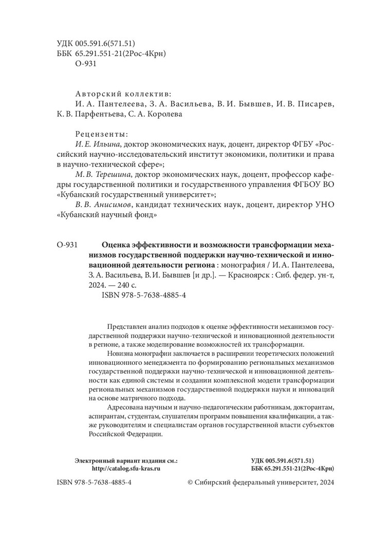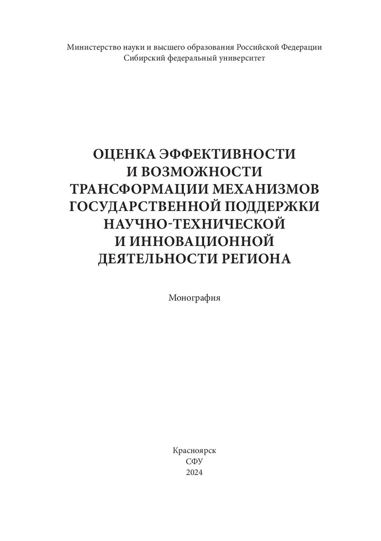 Библиографическое описание: Оценка эффективности и возможности трансформации механизмов государственной поддержки научно-технической и инновационной деятельности региона : монография / И. А. Пантелеева, З. А. Васильева, В. И. Бывшев [и др.] ; рец.: И. Е. Ильина, М. В. Терешина, В. В. Анисимов ; Сибирский федеральный университет, Институт управления бизнес-процессами. - Электрон. текстовые дан. (9,4 Мб). - Красноярск : СФУ, 2024 (2024-09-03). - 240 с., 15.0 усл. печ. л. : табл. - Загл. с титул. экрана. - Электрон. версия печ. публикации . - Библиогр.: с. 174-190. - 241 экз. - ISBN 978-5-7638-4885-4 : Б. ц. - Изд. № 2023-20113. - Текст : электронный.