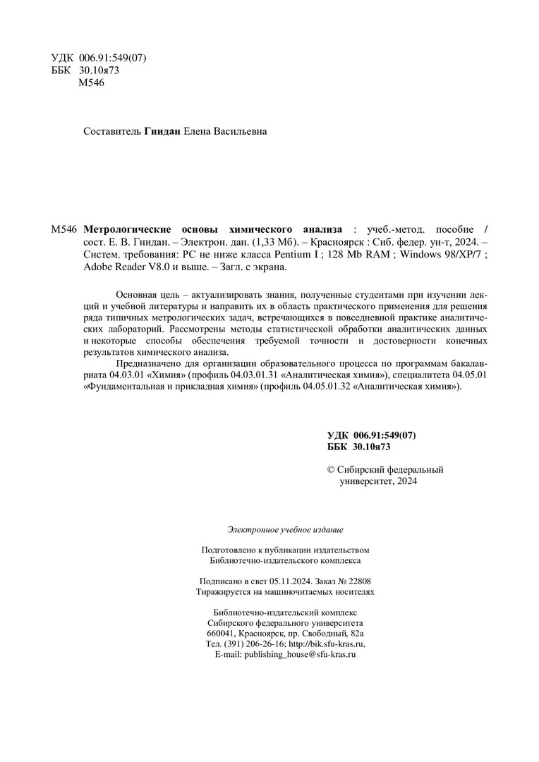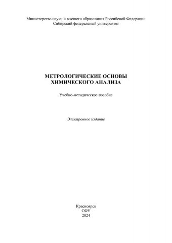 Библиографическое описание: Метрологические основы химического анализа : учебно-методическое пособие / Сиб. федер. ун-т, Ин-т цветных металлов ; сост. Е. В. Гнидан. - Электрон. текстовые дан. (pdf, 1,4 Мб). - Красноярск : СФУ, 2024 (2024-11-05). - 50 с. - Загл. с титул. экрана. - Изд. № 2024-22808 : Б. ц. - Текст : электронный.