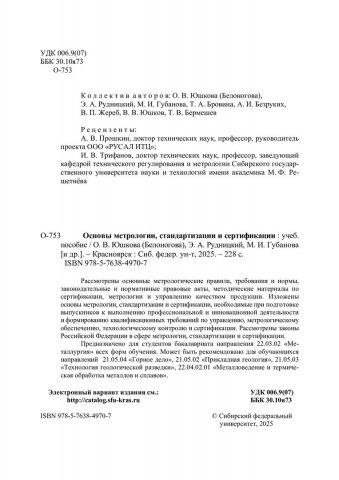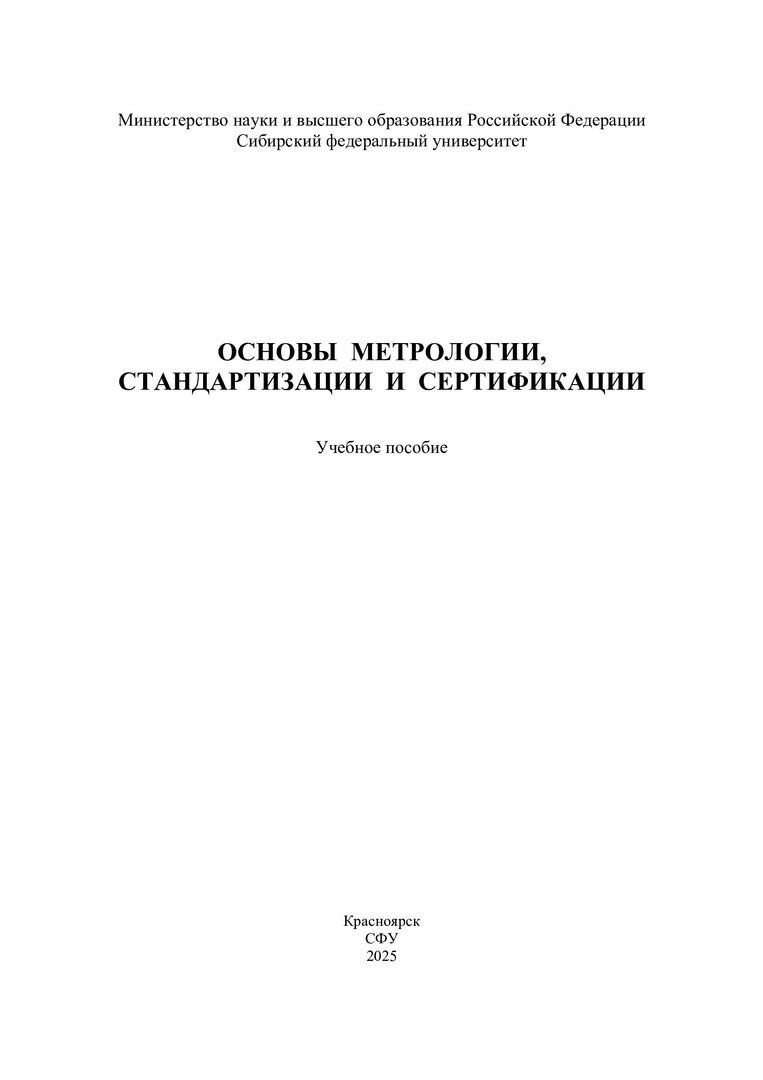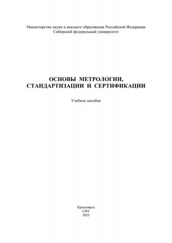 Библиографическое описание: Основы метрологии, стандартизации и сертификации : учебное пособие / О. В. Юшкова, Э. А. Рудницкий, М. И. Губанова [и др.] ; рец.: А. В. Прошкин, И. В. Трифанов ; Сибирский федеральный университет, Институт цветных металлов. - Электрон. текстовые дан. (pdf ; 5,6 Мб). - Красноярск : СФУ, 2025 (2025-03-25). - 228 с., 14.3 усл. печ. л. : рис., схемы, табл. - Загл. с титул. экрана. - Электрон. версия печ. публикации . - Библиогр.: с. 222-225. - 100 экз. - ISBN 978-5-7638-4970-7 : Б. ц. - Изд. № 2023-20854. - Текст : электронный.