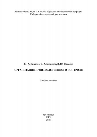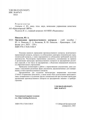 Библиографическое описание: Пикалов, Юрий Анатольевич. Организация производственного контроля : учебное пособие / Ю. А. Пикалов, С. А. Белякова, Я. Ю. Пикалов ; Сиб. федер. ун-т, Политехн. ин-т. - Электрон. текстовые дан. (pdf, 4 Мб). - Красноярск : СФУ, 2025 (2025-11-05). - 220 с. - Загл. с титул. экрана. - Электрон. версия печ. публикации . - 100 экз. - ISBN 978-5-7638-5106-9 : Б. ц. - Изд. № 2025-23836. - Текст : непосредственный + Текст : электронный.