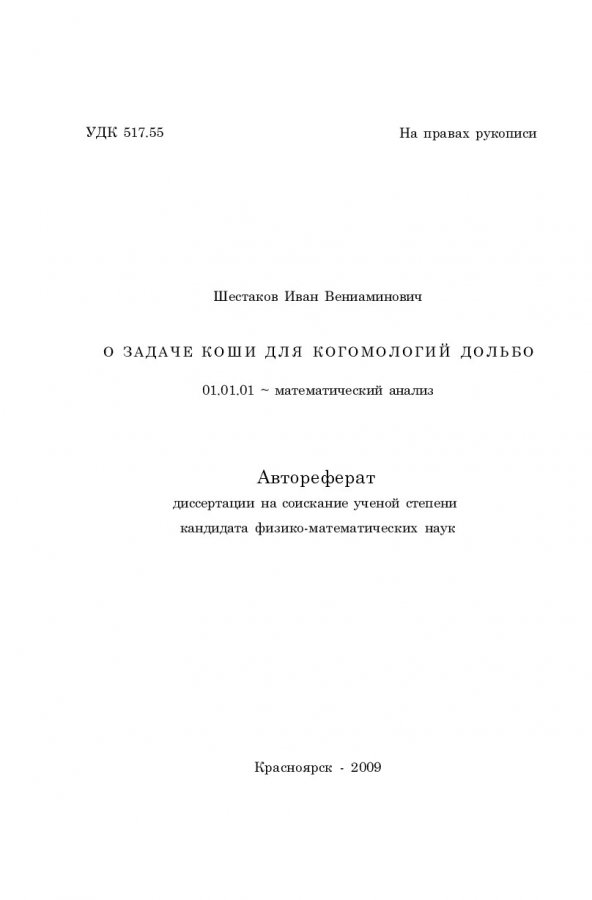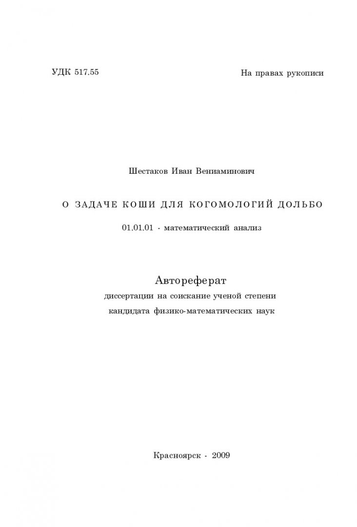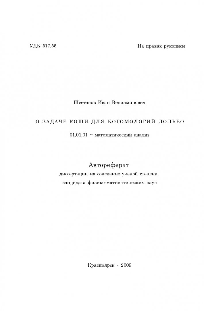 Библиографическое описание:Шестаков, Иван Вениаминович. О задаче Коши для когомологий Дольбо : автореферат дис. ... канд. физ.-мат. наук / И. В. Шестаков ; науч. рук. А. А. Шлапунов ; Сибирский федеральный университет (Красноярск). - Электрон. текстовые дан. (951 МБ). - Красноярск, 2009. - 18 с. - Электрон. версия печатного издания. - Текст : непосредственный + Текст : электронный.