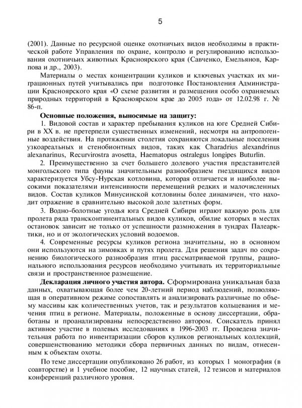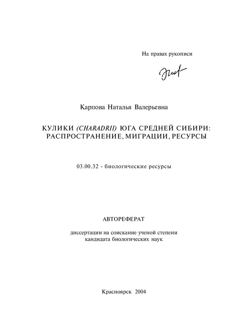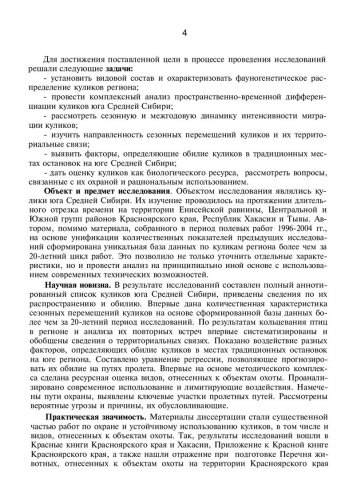 Библиографическое описание:Карпова, Наталья Валерьевна. Кулики (CHARADRII) юга Средней Сибири: распространение, миграции, ресурсы : автореферат диссертации ... кандидата биологических наук / Н. В. Карпова ; Красноярский университет [КрасГУ]. - Красноярск, 2004. - 29 с. - Текст : непосредственный + Текст : электронный.
