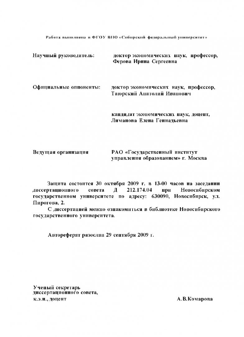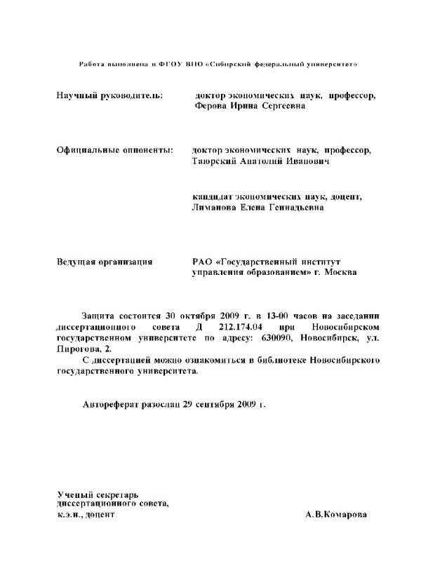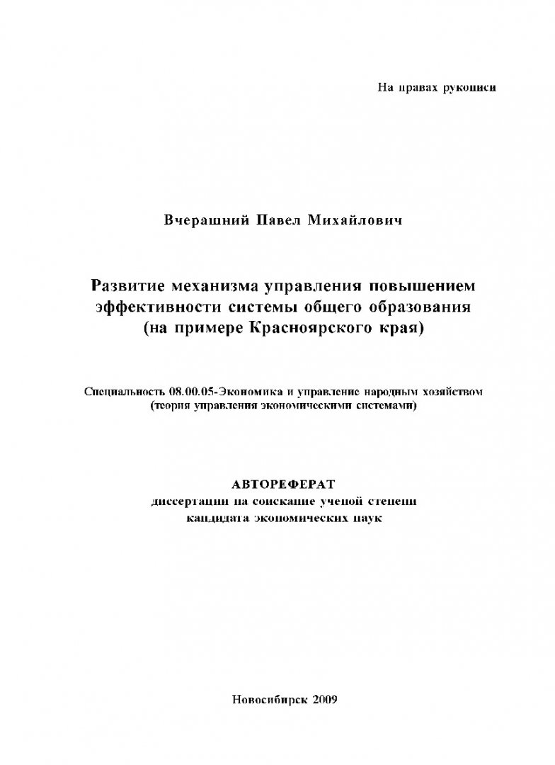 Развитие механизма управления повышением эффективности системы общего образования (на примере Красноярского края) : автореферат диссертации ... кандидата экономических наук