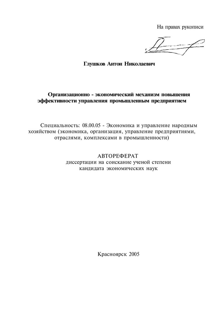 Организационно-экономический механизм повышения эффективности управления промышленным предприятием : автореферат диссертации ... кандидата экономических наук