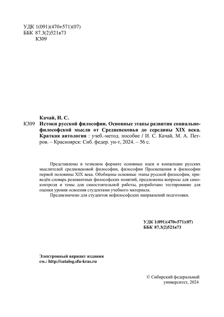 Библиографическое описание:Качай, Илья Сергеевич. Истоки русской философии. Основные этапы развития социально-философской мысли от средневековья до середины XIX века. Краткая антология : учебно-методическое пособие / И. С. Качай, М. А. Петров ; Сибирский федеральный университет. - Электрон. текстовые дан. (1,7 Мб). - Красноярск : СФУ, 2024 (2024-05-13). - 56 с. - Загл. с титул. экрана. - Электрон. версия печ. публикации . - Библиогр.: с. 37-38. - 100 экз. - Изд. № 2024-21704 : Б. ц. - Текст : электронный.