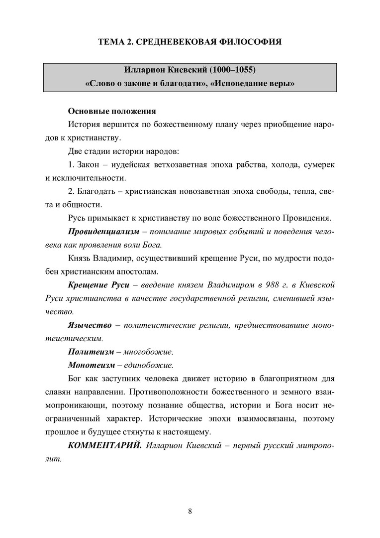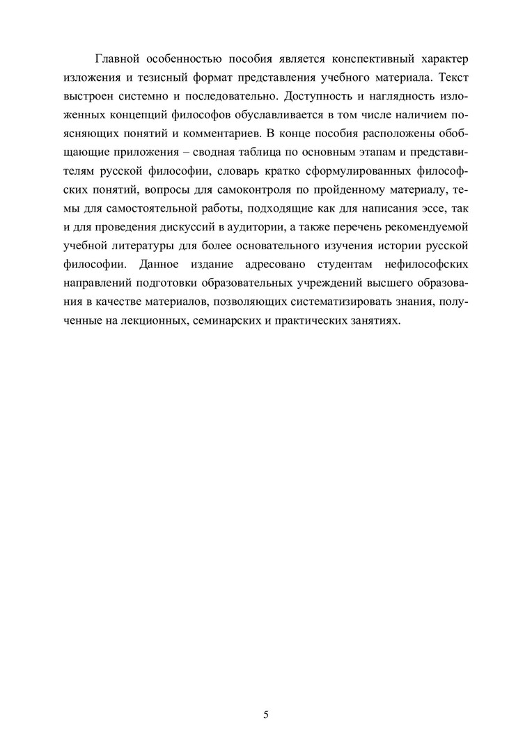 Аннотация:Представлены в тезисном формате основные идеи и концепции русских мыслителей средневековой философии, философии Просвещения и философии первой половины XIX века. Обобщены основные этапы русской философии, приведён словарь релевантных философских понятий, предложены вопросы для самоконтроля и темы для самостоятельной работы, разработано тестирование для оценки уровня освоения студентами учебного материала. Предназначено для студентов нефилософских направлений подготовки.