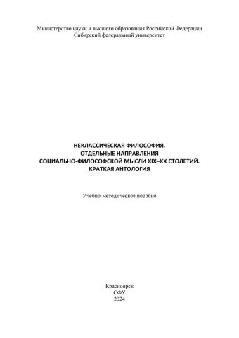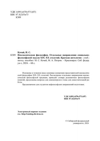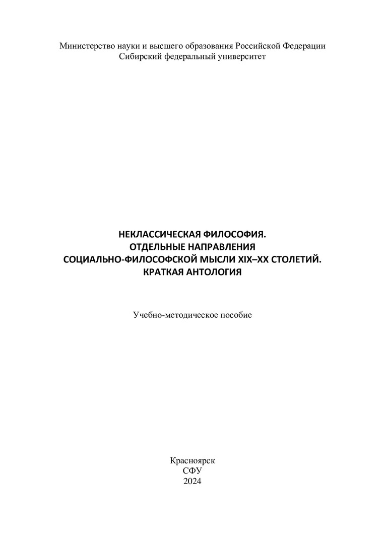 Библиографическое описание:Качай, Илья Сергеевич. Неклассическая философия. Отдельные направления социально-философской мысли XIX-XX столетий. Краткая антология : учебно-методическое пособие / И. С. Качай, М. А. Петров ; Сибирский федеральный университет. - Электрон. текстовые дан. (1,4 Мб). - Красноярск : СФУ, 2024 (2024-05-13). - 68 с. - Загл. с титул. экрана. - Электрон. версия печ. публикации . - Библиогр.: с. 55-57. - 100 экз. - Изд. № 2024-21703 : Б. ц. - Текст : электронный.