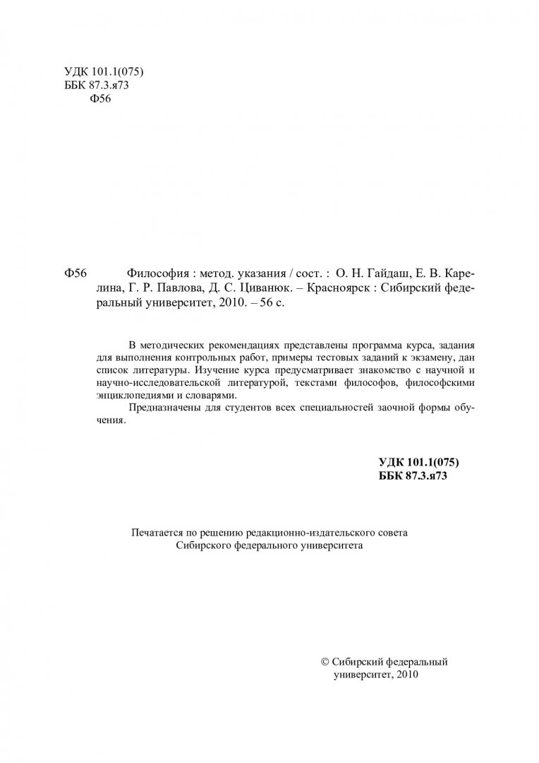 Библиографическое описание: Философия : методические указания / Сибирский федеральный университет [СФУ] ; сост. О. Н. Гайдаш [и др.]. - Красноярск : Сибирский федеральный университет [СФУ], 2010. - 54 с. - Список доп. лит.: с.53-54. - 26.00 р. - Текст : непосредственный + Текст : электронный.