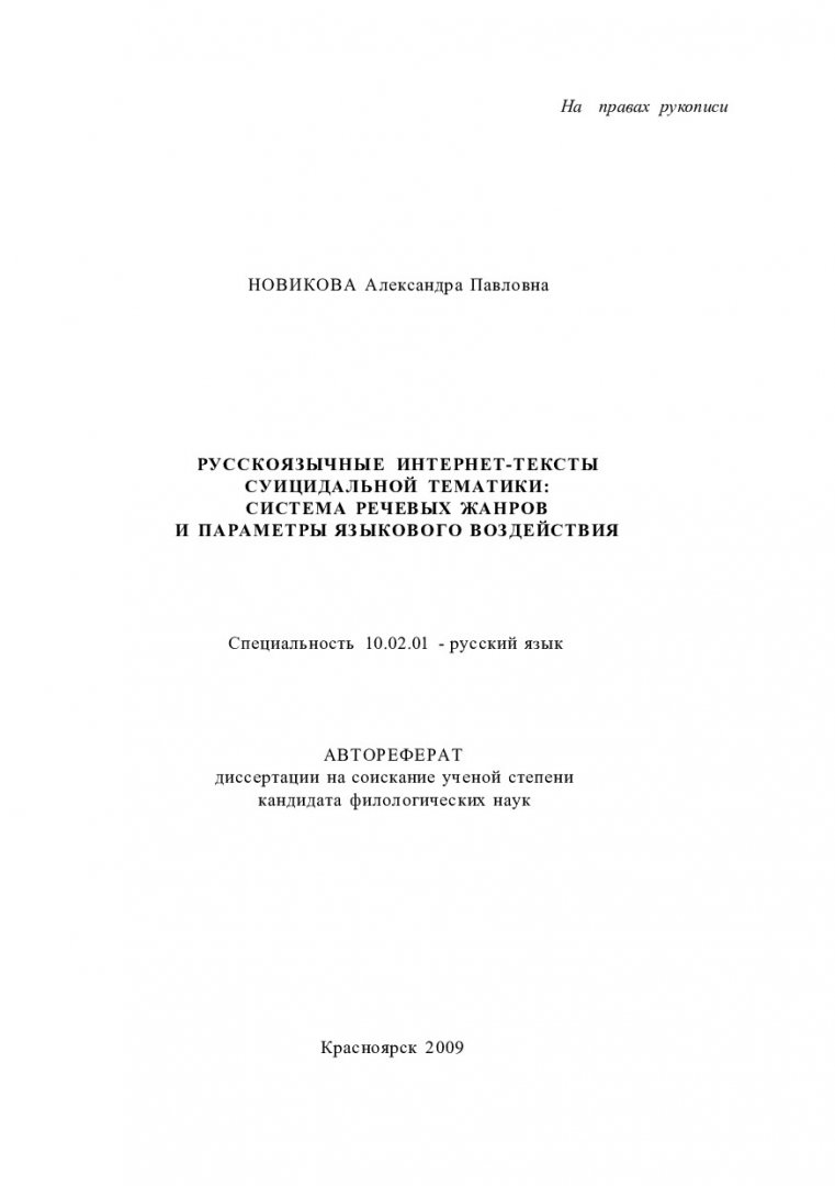 Русскоязычные интернет-тексты суицидальной тематики: система речевых жанров и параметры языкового воздействия : автореферат диссертации ... кандидата филологических наук