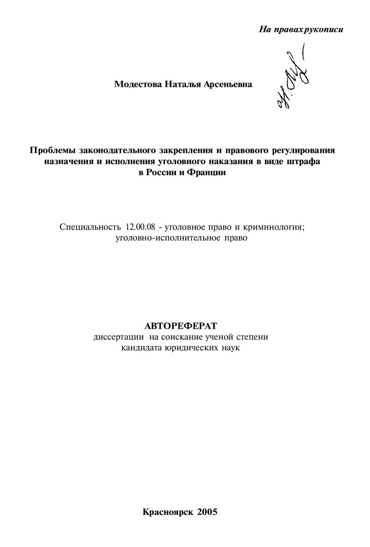 Проблемы законодательного закрепления и правового регулирования назначения и исполнения уголовного наказания в виде штрафа в России и Франции : автореферат диссертации ... кандидата юридических наук