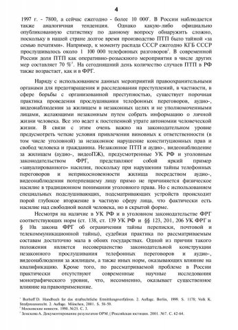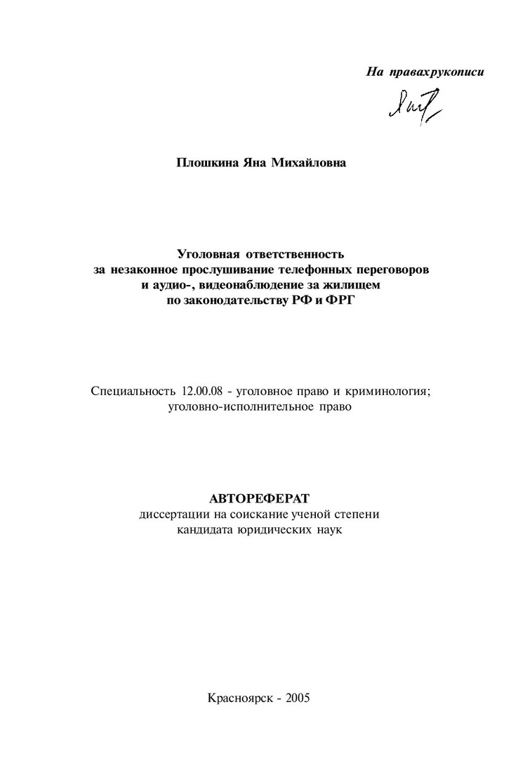 Библиографическое описание:Плошкина, Яна Михайловна. Уголовная ответственность за незаконное прослушивание телефонных переговоров и аудио-, видеонаблюдение за жилищем по законодательству РФ и ФРГ : специальность 12.00.08 "Уголовное право и криминология; уголовно-исполнительное право" : автореферат диссертации на соискание ученой степени кандидата юридических наук : защищена 27.10.2005 / Я. М. Плошкина ; науч. рук. А. Н. Тарбагаев ; Краснояр. гос. ун-т, Юрид. ин-т. - Красноярск, 2005. - 23 с. - Текст : непосредственный : электронный.