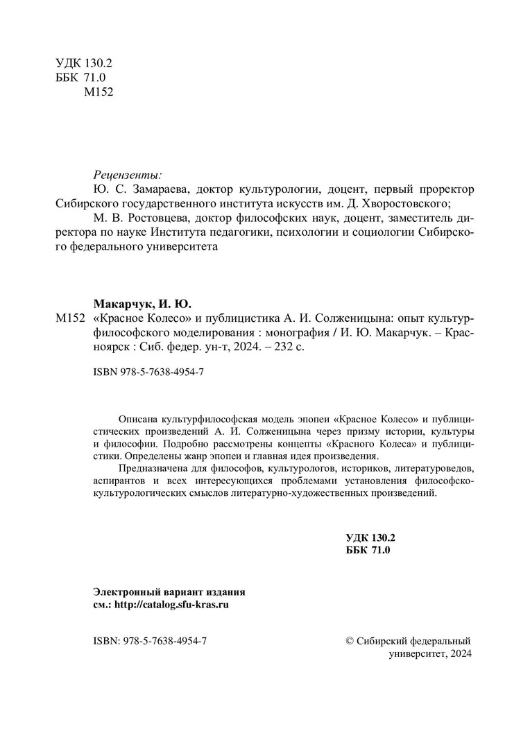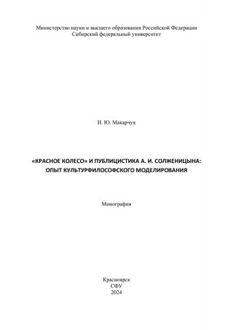 Библиографическое описание: Макарчук, Иван Юрьевич. "Красное колесо" и публицистика А. И. Солженицына: опыт культурфилософского моделирования : монография / И. Ю. Макарчук ; рец.: Ю. С. Замараева, М. В. Ростовцева ; Сибирский федеральный университет, Гуманитарный институт. - Электрон. текстовые дан. (5,1 Мб). - Красноярск : СФУ, 2024 (2024-04-22). - 232 с. - Загл. с титул. экрана. - Электрон. версия печ. публикации . - Библиогр.: с. 192-228. - 500 экз. - ISBN 978-5-7638-4954-7 : Б. ц. - Изд. № 2024-21337. - Текст : электронный.