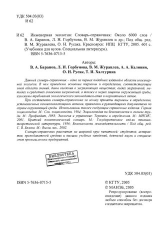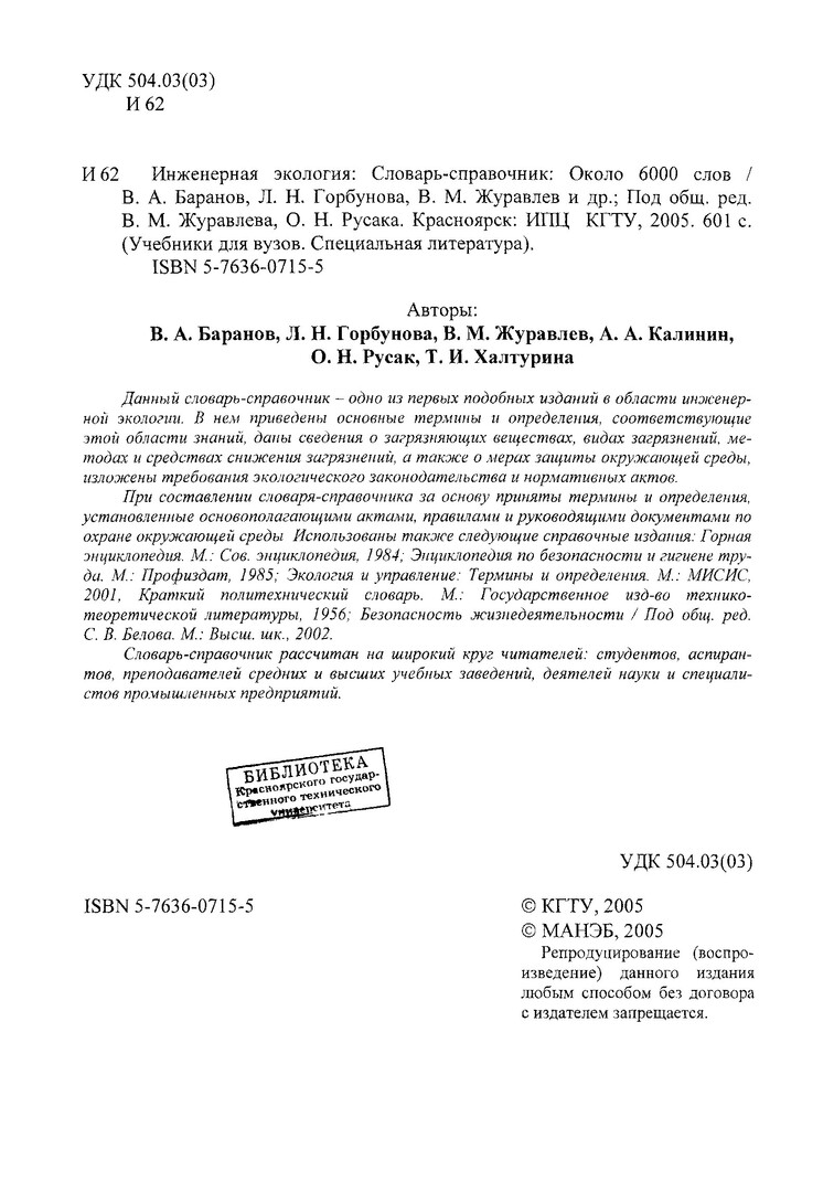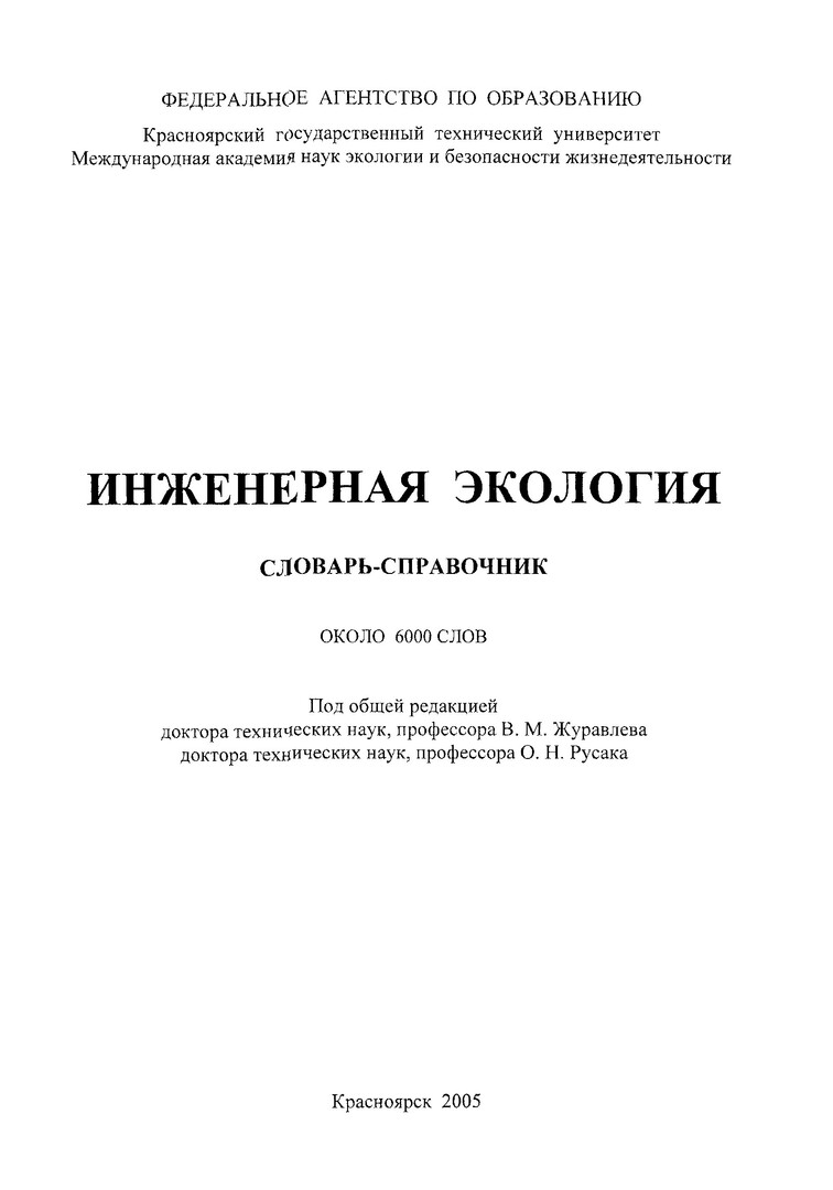 Библиографическое описание: Инженерная экология : словарь-справочник : около 6000 слов / В. А. Баранов [и др.] ; ред. : В. М. Журавлев, О. Н. Русак ; Краснояр. гос. техн. ун-т. - Красноярск : ИПЦ КГТУ, 2005. - 601 с. : ил. - ISBN 5-7636-0715-5 (в пер.). - Текст : непосредственный + Текст : электронный.