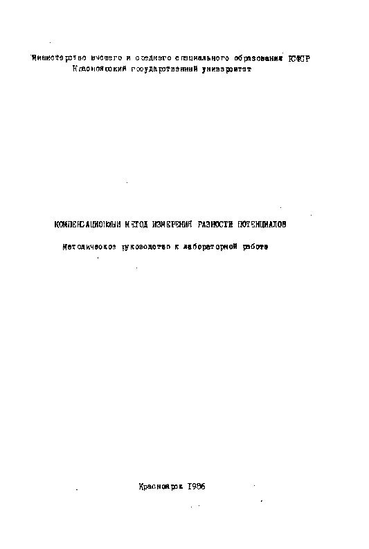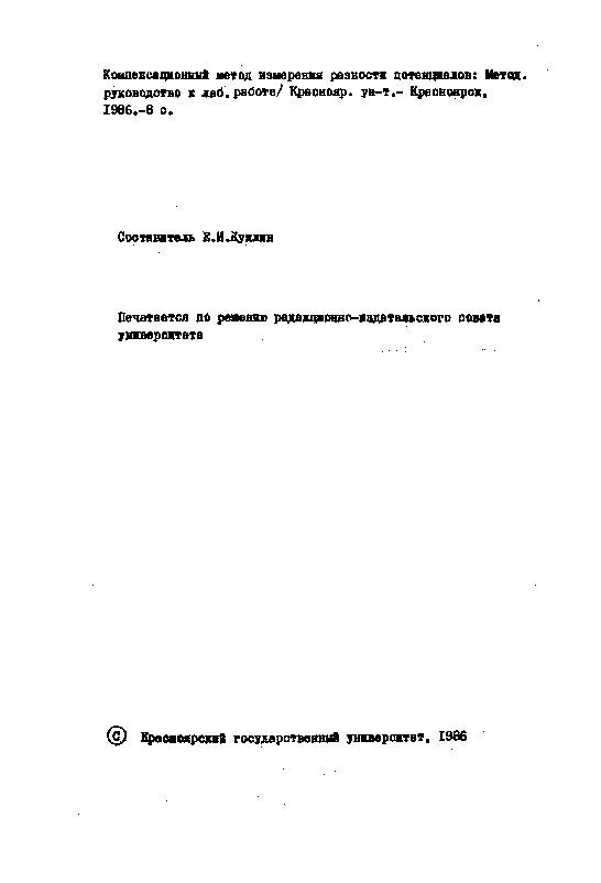 Библиографическое описание:Компенсационный метод измерения разности потенциалов : методическое руководство к лабораторной работе / Краснояр. гос. ун-т ; сост. Е. И. Куклин. - Электрон. текстовые дан. (0,2 Мб). - Красноярск : КрасГУ, 1986. - 8 с. - Загл. с титул. экрана. - Электрон. версия печ. публикации . - Б. ц. - Текст : электронный.