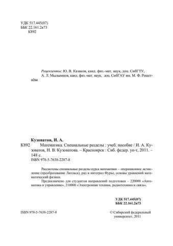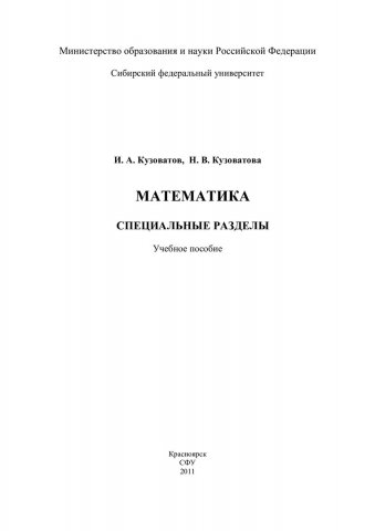 Библиографическое описание: Кузоватов, Игорь Анатольевич. Математика. Специальные разделы : учебное пособие / И. А. Кузоватов, Н. В. Кузоватова ; Сиб. федерал. ун-т, Ин-т фундаментал. подготовки. - Красноярск : СФУ, 2011. - 147 с. - ISBN 978-5-7638-2287-8 : 125.00 р., 238.00 р., 322.00 р. - Текст : непосредственный + Текст : электронный.
