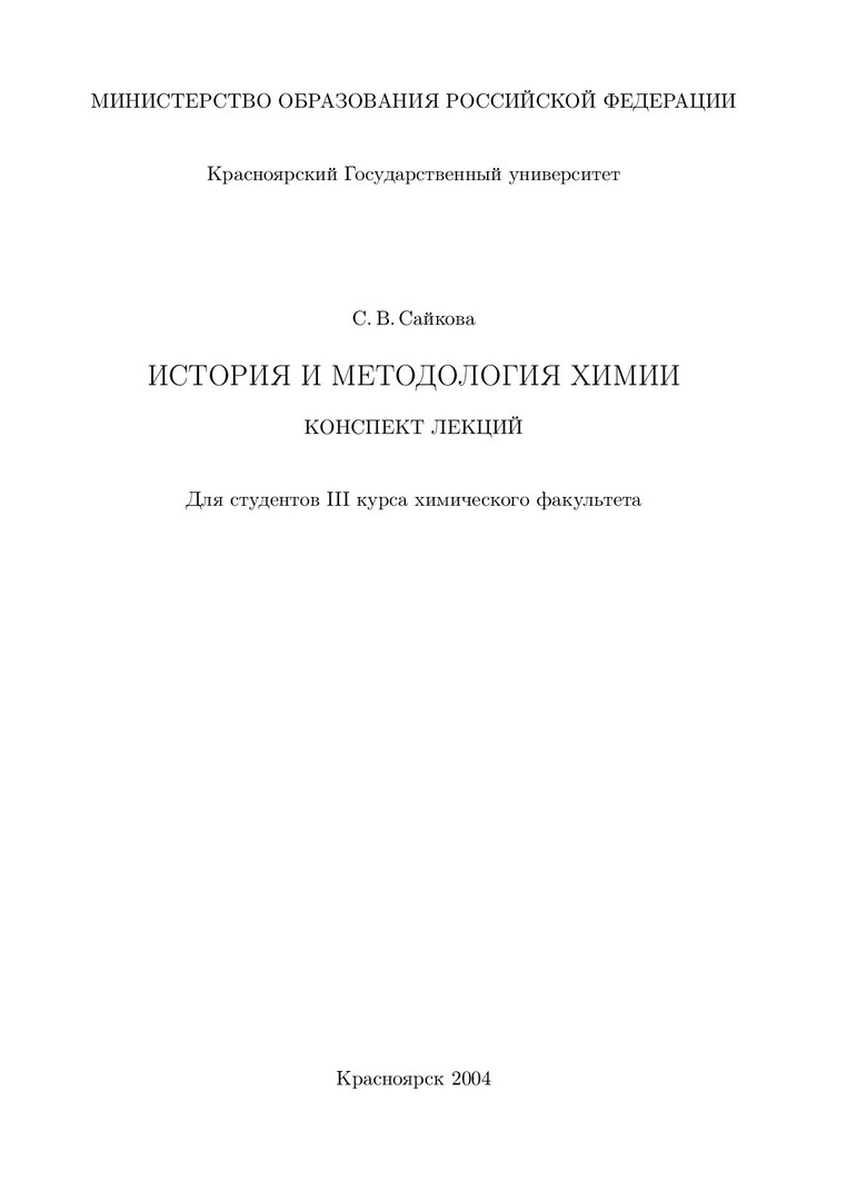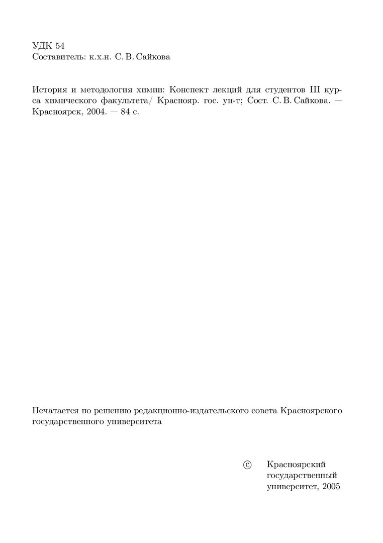 Библиографическое описание:История и методология химии : конспект лекций для студентов III курса химического факультета / Красноярский университет [КрасГУ] ; сост. С. В. Сайкова. - Красноярск : Красноярский университет [КрасГУ], 2004. - Б. ц. - Текст : непосредственный. Электронная версия печатного издания. Формат: PDF (Adobe Acrobat Reader); Размер: 3.2Мб; Доступ: локальная сеть СФУ