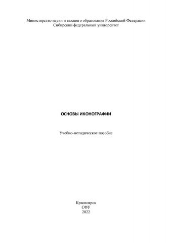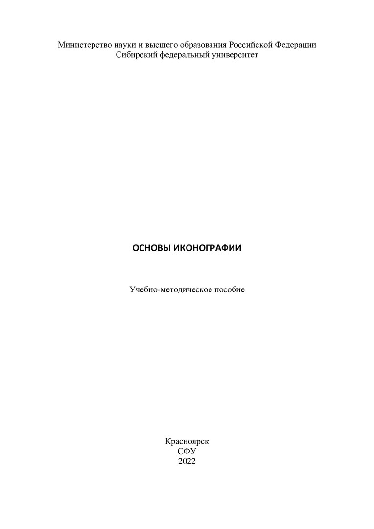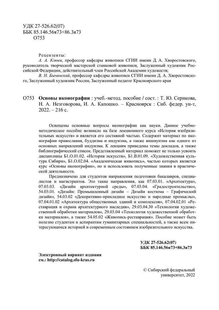 Библиографическое описание: Основы иконографии : учебно-методическое пособие / Сибирский федеральный университет, Институт архитектуры и дизайна ; сост.: Т. Ю. Серикова, Н. А. Незговорова, И. А. Капошко. - Электрон. текстовые дан. (pdf ; 8,8 Мб). - Красноярск : СФУ, 2022 (2022-05-05). - 216 с. : ил., цв. ил. - Загл. с титул. экрана. - Электрон. версия печ. публикации . - Библиогр.: с. 210-212. - 100 экз. - Изд. № 2022-16206 : Б. ц. - Текст : электронный.