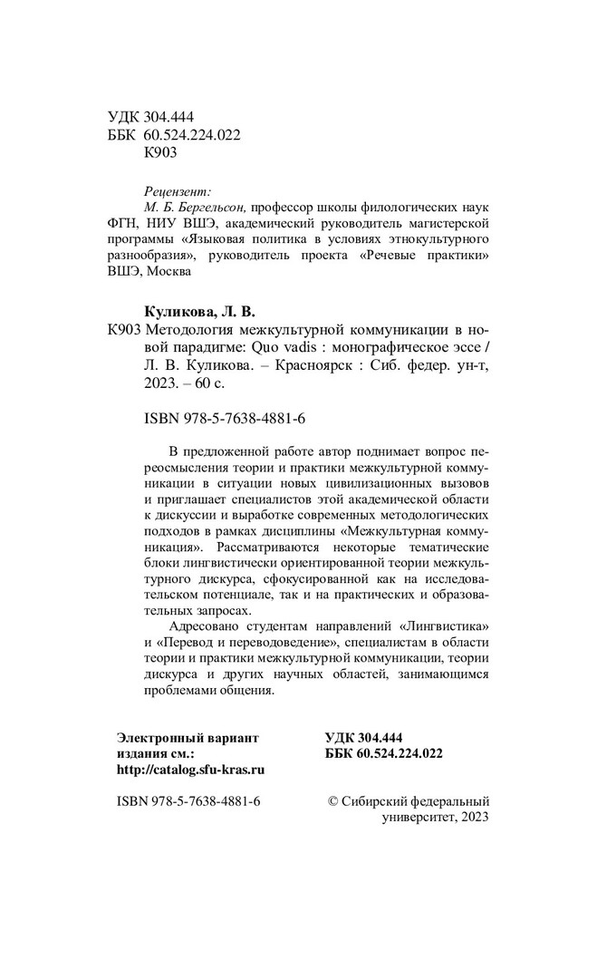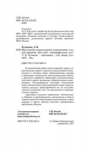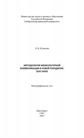 Библиографическое описание: Куликова, Людмила Викторовна. Методология межкультурной коммуникации в новой парадигме: Quo vadis : монографическое эссе / Л. В. Куликова ; Сиб. федер. ун-т, Ин-т филологии и яз. коммуникации. - Красноярск : СФУ, 2023 (2023-11-28). - 60 с. - 100 экз. - ISBN 978-5-7638-4881-6 : Б. ц. - Изд. № 2023-20026. - Текст : непосредственный + Текст : электронный.