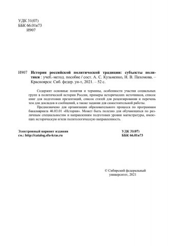 Библиографическое описание: История российской политической традиции: субъекты политики : учебно-методическое пособие / Сибирский федеральный университет, Гуманитарный институт ; сост.: А. С. Кузьменко, Н. В. Пахомова. - Красноярск : СФУ, 2021 (2021-12-16). - 52 с., 3.0 усл. печ. л. - 100 экз. - Изд. № 2021-14964 : Б. ц. - Текст : электронный.