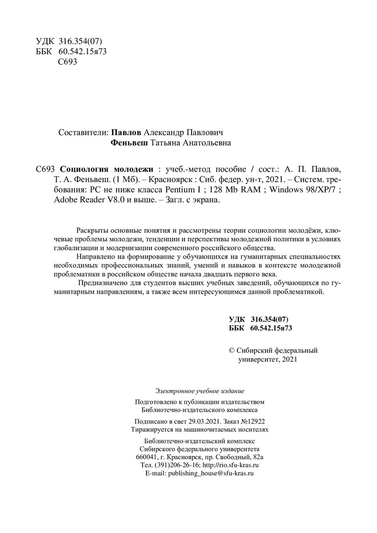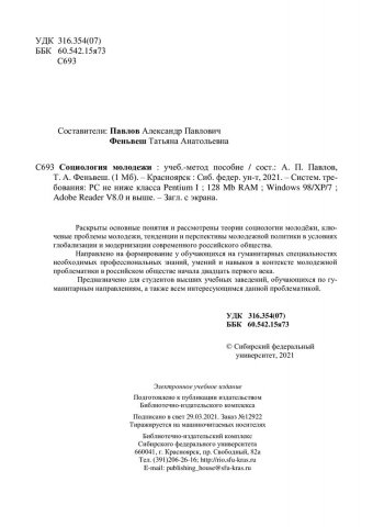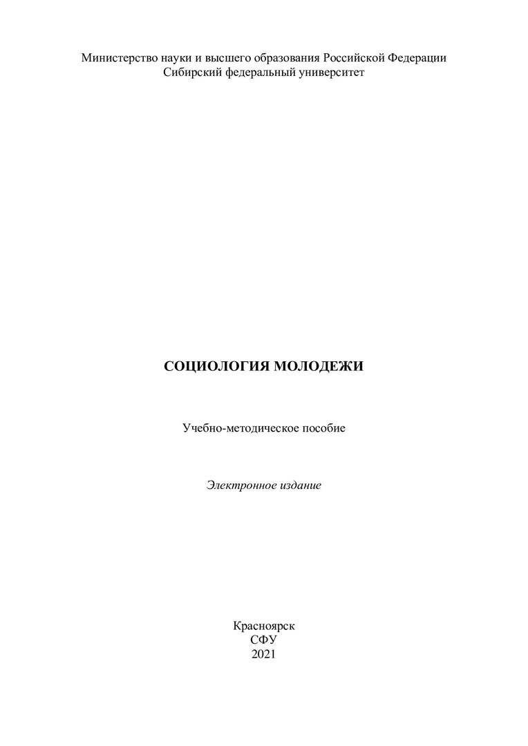 Библиографическое описание: Социология молодежи : учебно-методическое пособие / Сиб. федер. ун-т, Ин-т педагогики, психологии и социологии ; сост.: А. П. Павлов, Т. А. Феньвеш. - Электрон. текстовые дан. (pdf, 1 Мб). - Красноярск : СФУ, 2021 (2021-02-06). - 34 с. - Загл. с титул. экрана. - Изд. № 2021-12922 : Б. ц. - Текст : электронный.