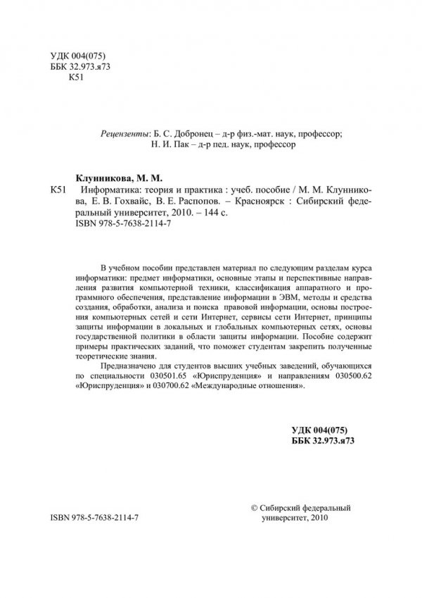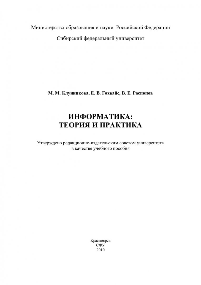 Библиографическое описание:Клунникова, Маргарита Михайловна. Информатика: теория и практика : учебное пособие / М. М. Клунникова, Е. В. Гохвайс, В. Е. Распопов ; Сиб. федер. ун-т. - Красноярск : СФУ, 2010. - 144 с. - Библиогр. список : с.141-142. - ISBN 978-5-7638-2114-7 : 65 р. - Текст : непосредственный + Текст : электронный.