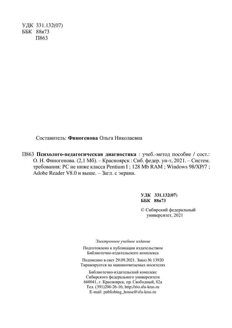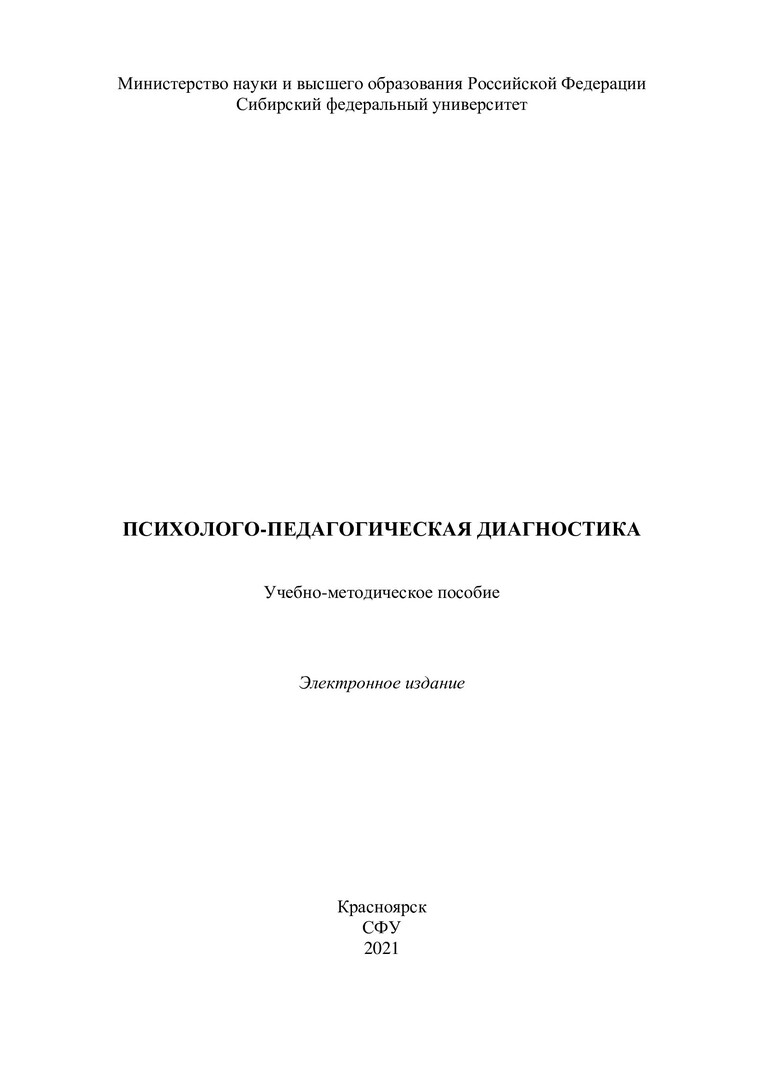 Библиографическое описание: Психолого-педагогическая диагностика : учебно-методическое пособие / Сиб. федер. ун-т, Ин-т педагогики, психологии и социологии ; сост. О. Н. Финогенова. - Электрон. текстовые дан. (pdf, 2,2 Мб). - Красноярск : СФУ, 2021 (2021-06-04). - 84 с. - Загл. с титул. экрана. - Изд. № 2021-13920 : Б. ц. - Текст : электронный.