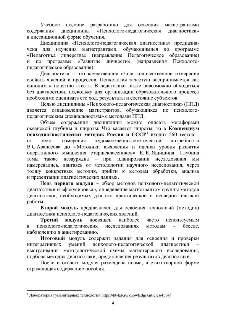 Аннотация: Учебное пособие разработано для освоения магистрантами содержания дисциплины «Психолого-педагогическая диагностика» в дистанционной форме обучения. Дисциплина «Психолого-педагогическая диагностика» предназначена для изучения магистрантами, обучающимися по программе «Педагогика лидерства» (направление Педагогическое образование) и по программе «Развитие личности» (направления Психолого-педагогическое образование).