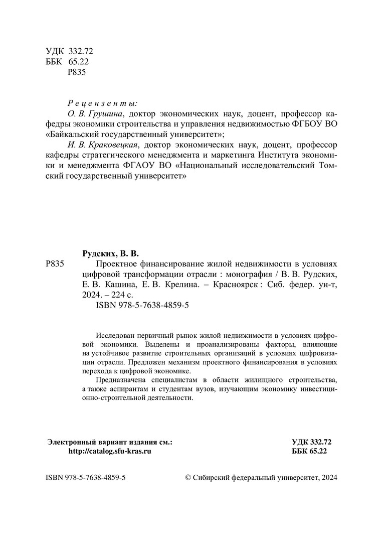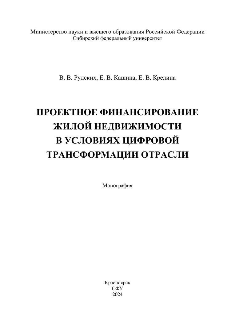Библиографическое описание: Рудских, Валерия Викторовна. Проектное финансирование жилой недвижимости в условиях цифровой трансформации отрасли : монография / В. В. Рудских, Е. В. Кашина, Е. В. Крелина ; рец.: О. В. Грушина, И. В. Краковецкая ; Сибирский федеральный университет, Инженерно-строительный институт. - Электрон. текстовые дан. (5,1 Мб). - Красноярск : СФУ, 2024 (2024-05-22). - 224 с., 14.0 усл. печ. л. - Загл. с титул. экрана. - Электрон. версия печ. публикации . - Библиогр.: с. 149-165. - 500 экз. - ISBN 978-5-7638-4859-5 : Б. ц. - Изд. № 2023-19357. - Текст : электронный.