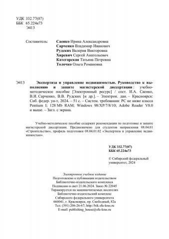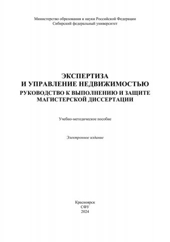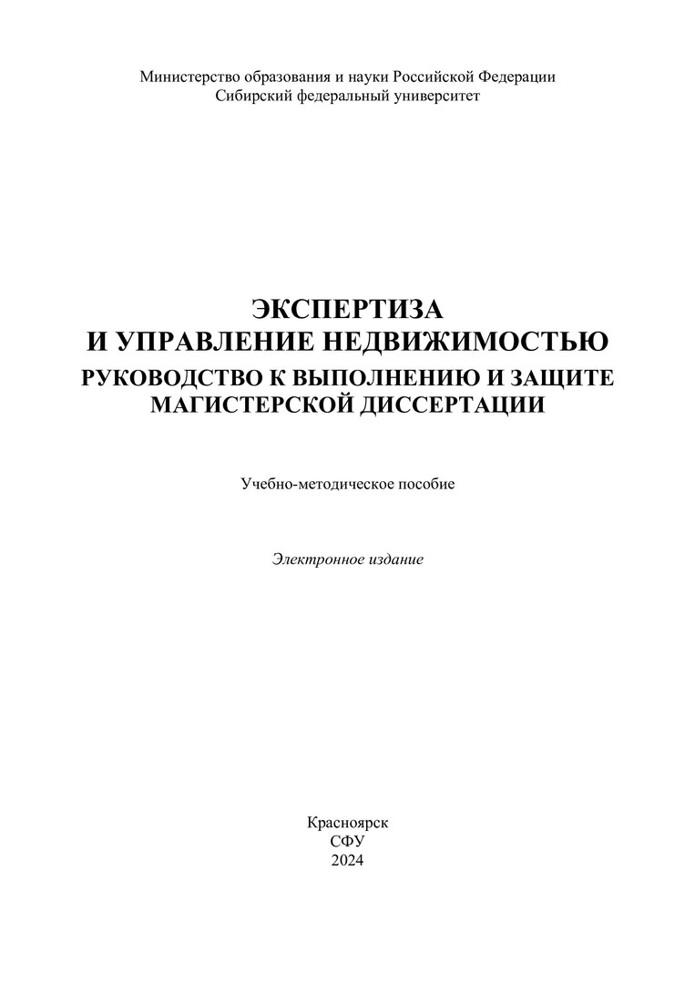 Библиографическое описание:Экспертиза и управление недвижимостью. Руководство к выполнению и защите магистерской диссертации : учебно-методическое пособие / Сибирский федеральный университет, Инженерно-строительный институт ; сост. И. А. Саенко [и др.]. - Электрон. текстовые дан. (pdf, 0,6 Мб). - Красноярск : СФУ, 2024. - 51 с. - Загл. с титул. экрана. - Изд. № 2024-22045 : Б. ц. - Текст : электронный.