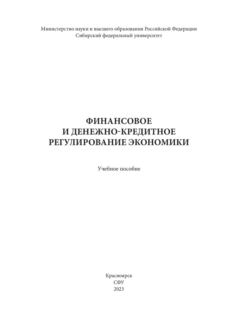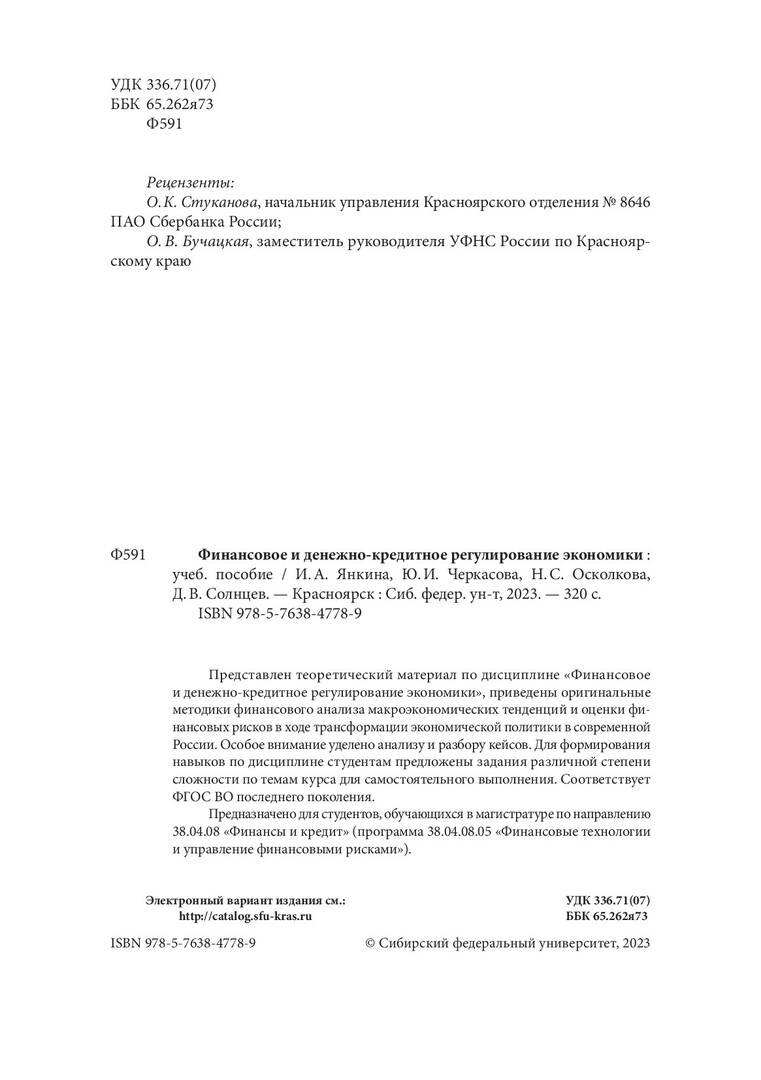 Библиографическое описание: Финансовое и денежно-кредитное регулирование экономики : учебное пособие / И. А. Янкина, Ю. И. Черкасова, Н. С. Осколкова, Д. В. Солнцев ; рец.: О. К. Стуканова, О. В. Бучацкая ; Сибирский федеральный университет, Институт экономики, государственного управления и финансов. - Электрон. текстовые дан. (11,9 Мб). - Красноярск : СФУ, 2023 (2023-09-15). - 320 с., 20.0 усл. печ. л. : схемы, табл. - Загл. с титул. экрана. - Электрон. версия печ. публикации . - Библиогр.: с. 306-312. - 100 экз. - ISBN 978-5-7638-4778-9 : Б. ц. - Изд. № 2022-17723. - Текст : электронный.