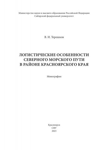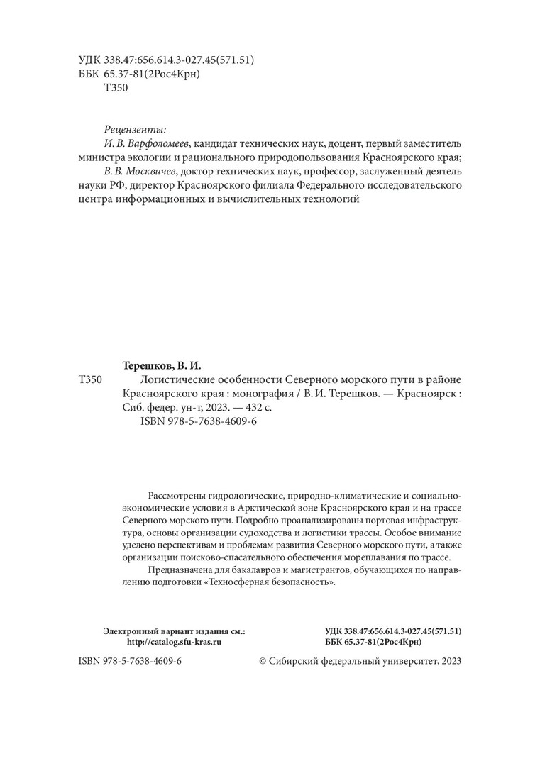 Библиографическое описание: Терешков, Валерий Ильич. Логистические особенности Северного морского пути в районе Красноярского края : монография / В. И. Терешков ; рец.: И. В. Варфоломеев, В. В. Москвичев ; Сибирский федеральный университет, Политехнический институт. - Электрон. текстовые дан. (37,6 Мб). - Красноярск : СФУ, 2023 (2023-12-28). - 432 с., 27.0 усл. печ. л. : граф., цв. ил., табл. - Загл. с титул. экрана. - Электрон. версия печ. публикации . - Библиогр.: с. 419-427. - 500 экз. - ISBN 978-5-7638-4609-6 : Б. ц. - Изд. № 2021-15101. - Текст : электронный.
