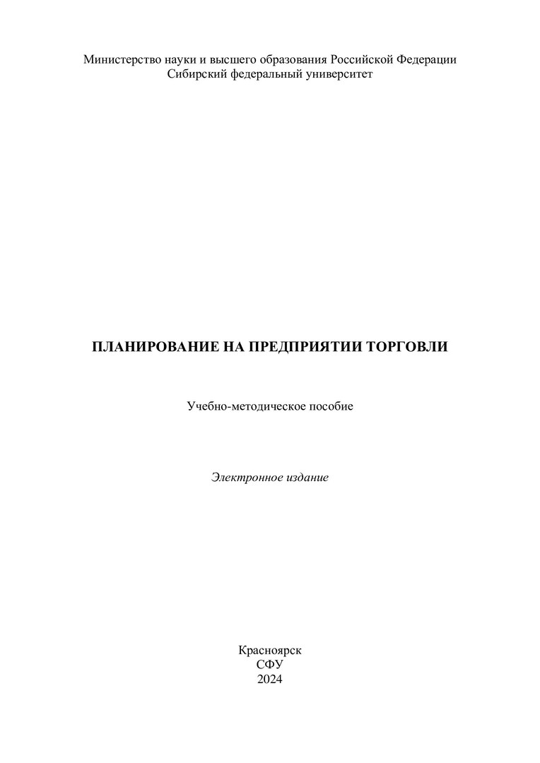 Библиографическое описание:Планирование на предприятии торговли : учебно-методическое пособие / Сиб. федер. ун-т, Ин-т торговли и сферы услуг ; сост.: Н. Н. Терещенко, О. Н. Есина. - Электрон. текстовые дан. (pdf, 1,5 Мб). - Красноярск : СФУ, 2024 (2024-04-02). - 43 с. - Загл. с титул. экрана. - Изд. № 2024-21284 : Б. ц. - Текст : электронный.
