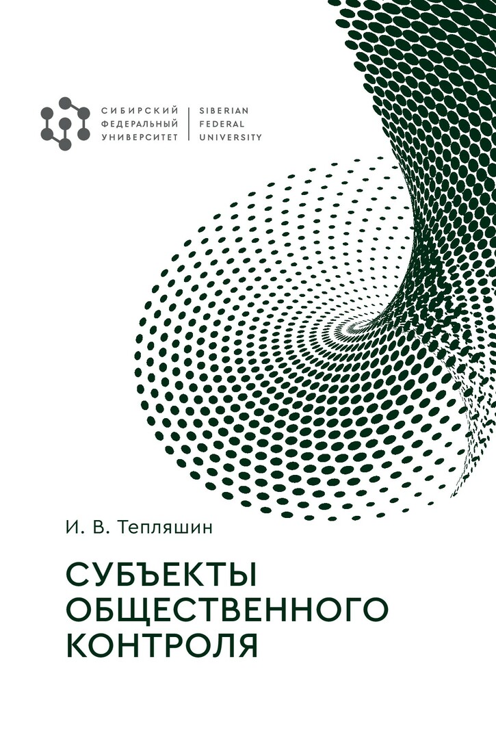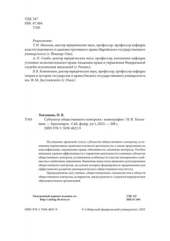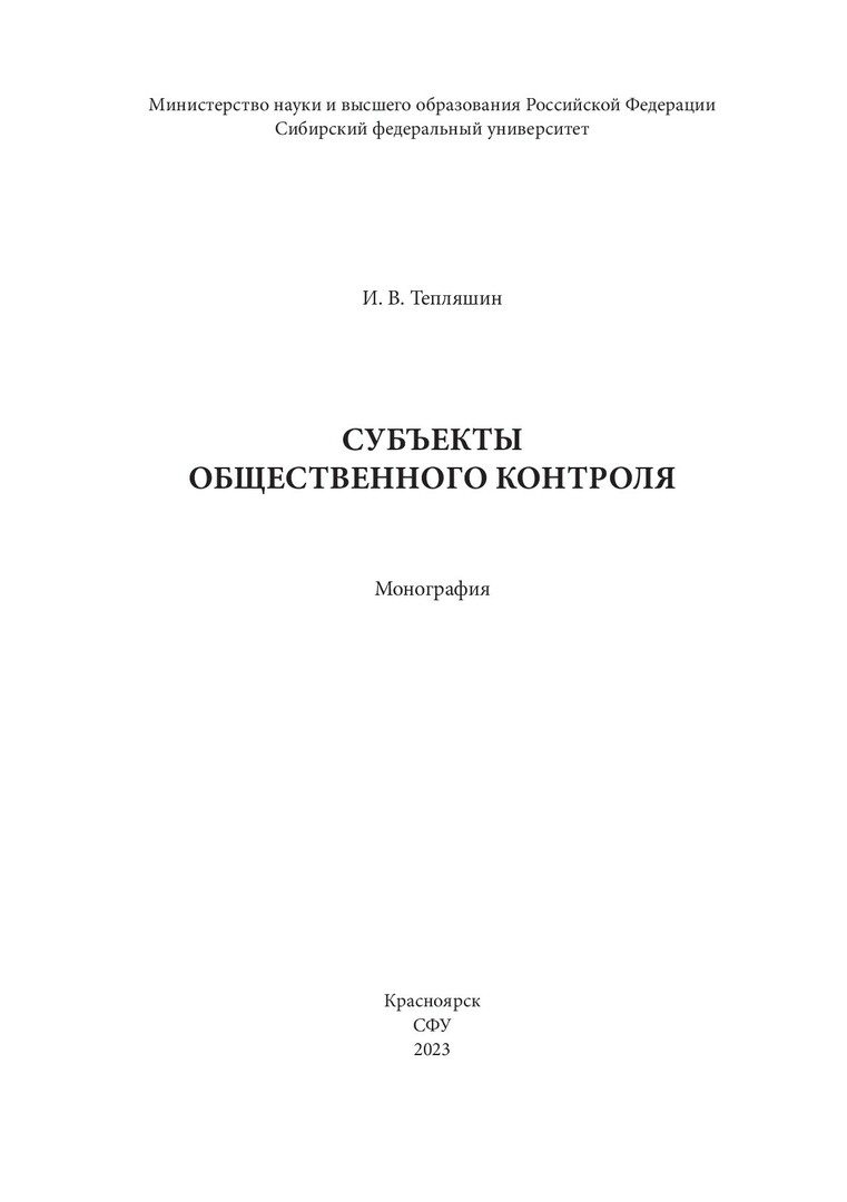 Библиографическое описание: Тепляшин, Иван Владимирович. Субъекты общественного контроля : монография / И. В. Тепляшин ; рец.: Т. Н. Михеева, А. П. Скиба, В. В. Кожевников ; Сибирский федеральный университет, Юридический институт. - Электрон. текстовые дан. (1,5 Мб). - Красноярск : СФУ, 2023 (2023-10-24). - 208 с., 13.0 усл. печ. л. - Загл. с титул. экрана. - Электрон. версия печ. публикации . - Библиогр.: с. 172-206. - 500 экз. - ISBN 978-5-7638-4822-9 : Б. ц. - Изд. № 2023-18420. - Текст : электронный.