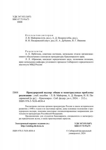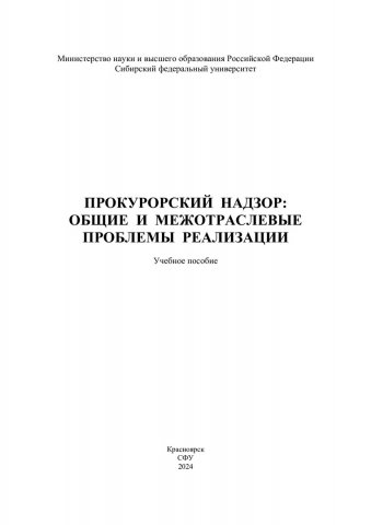 Библиографическое описание: Прокурорский надзор: общие и межотраслевые проблемы реализации : учебное пособие / Л. В. Майорова, А. Д. Назаров, И. И. Писаревский [и др.] ; ред. А. Д. Назаров ; отв. ред. Л. В. Майорова ; науч. ред. И. И. Писаревский ; рец.: А. Е. Ирбеткин, Л. Л. Абрамова ; Сибирский федеральный университет, Юридический институт. - Электрон. текстовые дан. (4,7 Мб). - Красноярск : СФУ, 2024 (2024-02-27). - 212 с., 13.3 усл. печ. л. - Загл. с титул. экрана. - Электрон. версия печ. публикации . - Библиогр.: с. 93-106. - 100 экз. - ISBN 978-5-7638-4830-4 : Б. ц. - Изд. № 2023-18707. - Текст : электронный.