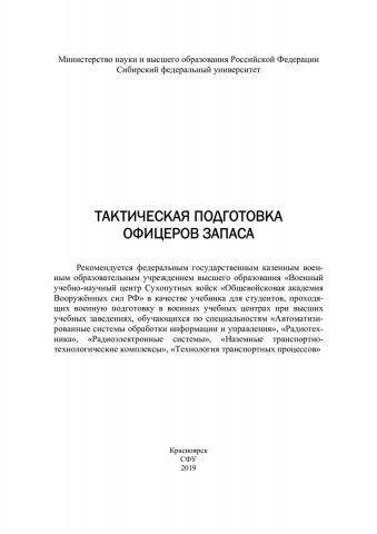 Библиографическое описание: Тактическая подготовка офицеров запаса : учебник для студентов, проходящих военную подготовку в военных учебных центрах при вузах / В. С. Янович, Ю. Б. Байрамуков, П. Е. Арефьев [и др.] ; Сибирский федеральный университет, Военно-инженерный институт. - Красноярск : СФУ, 2019 (2019-10-24). - 301 с. : рис., табл. - Библиогр.: с. 263. - 500 экз. - ISBN 978-5-7638-4143-5 : 681.00 р., 490.00 р. - Изд. № 2019-8425. - Текст : непосредственный + Текст : электронный.