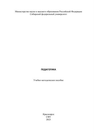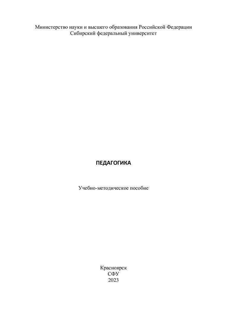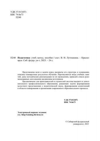 Библиографическое описание: Педагогика : учебно-методическое пособие / Сибирский федеральный университет ; сост. В. Н. Лутошкина. - Электрон. текстовые дан. (1,4 Мб). - Красноярск : СФУ, 2023 (2023-10-30). - 24 с. - Загл. с титул. экрана. - Электрон. версия печ. публикации . - Библиогр.: с. 19-20. - 100 экз. - Изд. № 2023-20261 : Б. ц. - Текст : электронный.