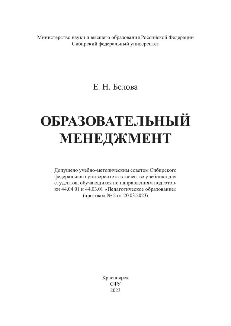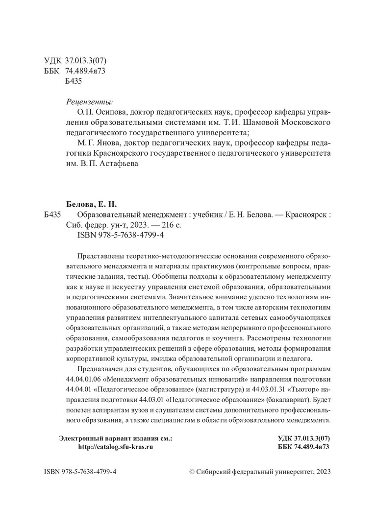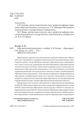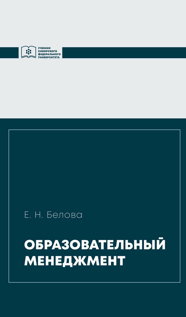 Библиографическое описание: Белова, Елена Николаевна. Образовательный менеджмент : учебник для студентов, обучающихся по направлениям подготовки 44.04.01 и 44.03.01 «Педагогическое образование» / Е. Н. Белова ; рец.: О. П. Осипова, М. Г. Янова ; Сибирский федеральный университет, Институт педагогики, психологии и социологии. - Электрон. текстовые дан. (6,3 Мб). - Красноярск : СФУ, 2023 (2023-07-20). - 216 с., 13.5 усл. печ. л. : табл., схемы. - (Учебник Сибирского федерального университета). - Загл. с титул. экрана. - Электрон. версия печ. публикации . - Библиогр.: с. 212-214. - 500 экз. - ISBN 978-5-7638-4799-4 : Б. ц. - Изд. № 2023-18176. - Текст : электронный.
